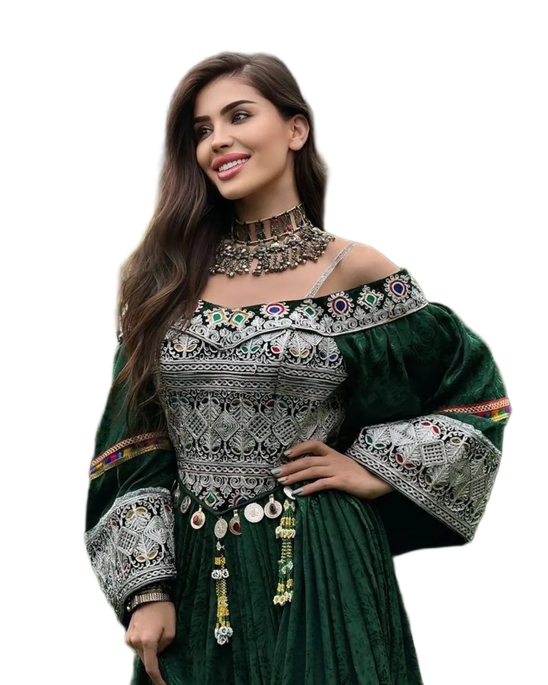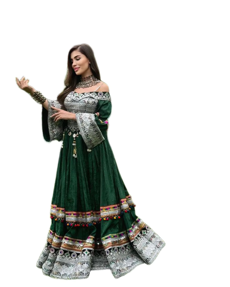 New Arrival Green Off Shoulder Traditional Afghan Dress For Women With Handmade Embroidery Mirror Work