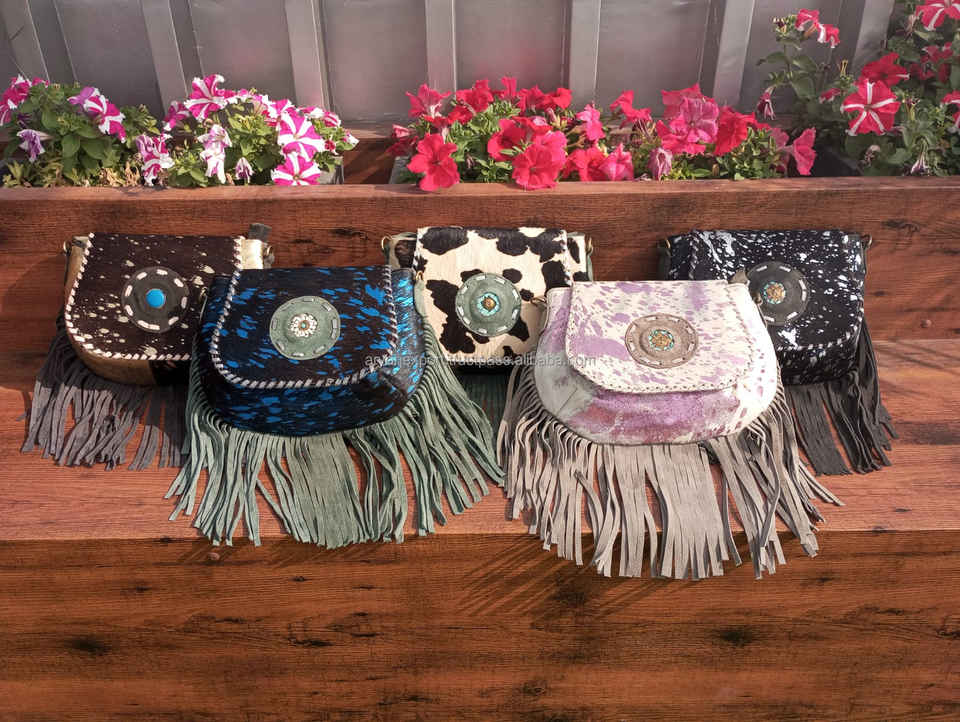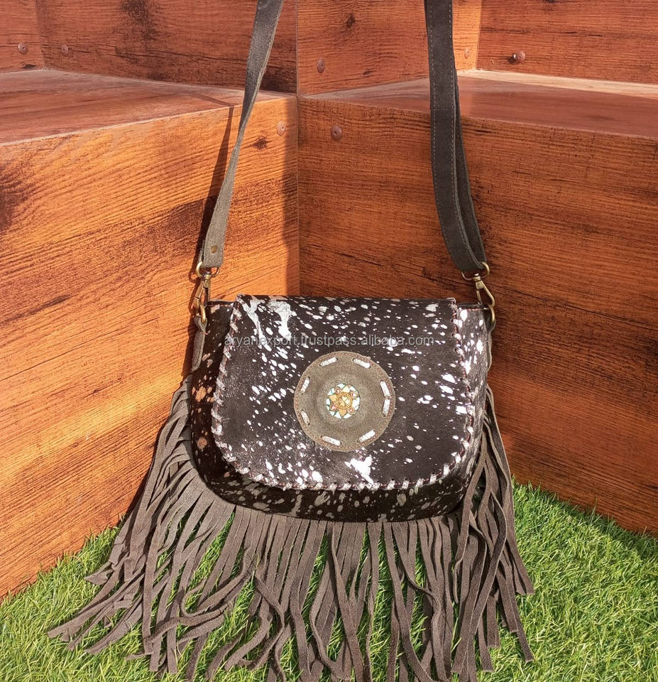 New Arrival Hair on Hide Fur Leather Fringe Designer Concho Sling Bag Metallic Fur Suede Leather Bag Party Wear Women Sling Bags