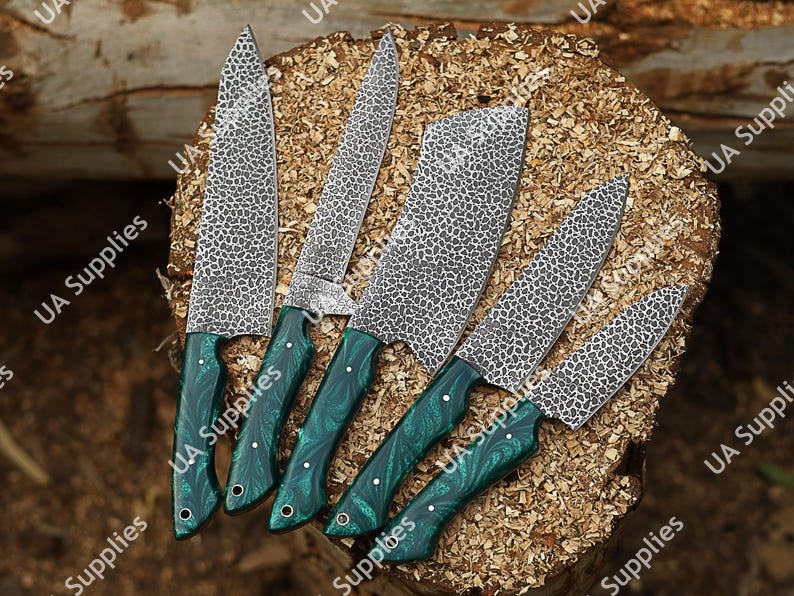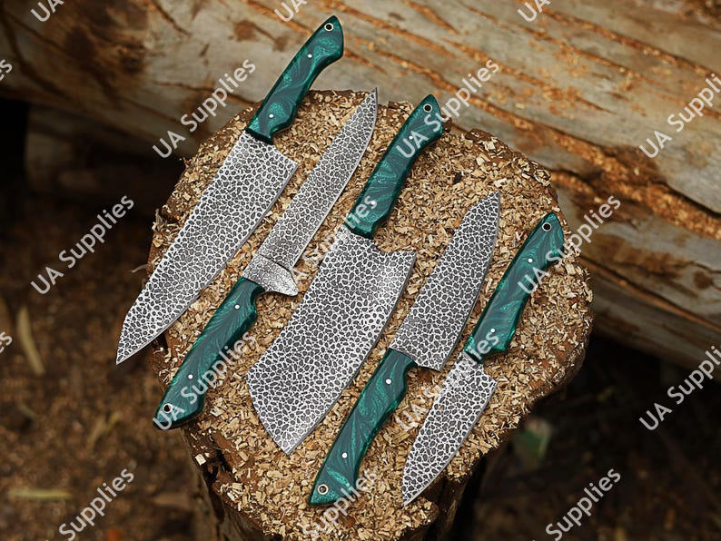 New Arrival Hand Forged Damascus Steel Etched Blade Customizable 5 Pcs Razor Sharp 58 HRC Kitchen Knives Chef Set Leather Bag