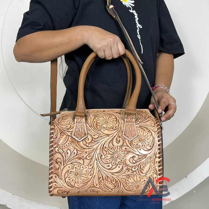 New Arrival Hand Tooled Floral Cowhide Leather Small Speedy Bags Western Travel Purse Vintage Style Genuine Leather Duffle Bags