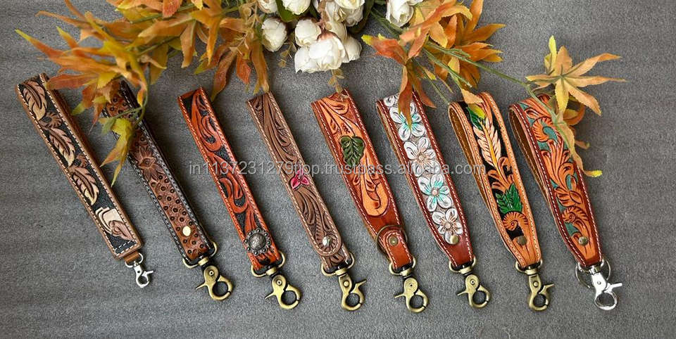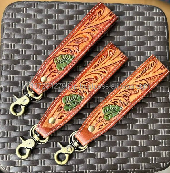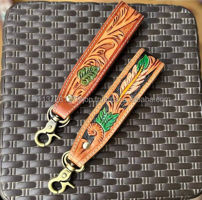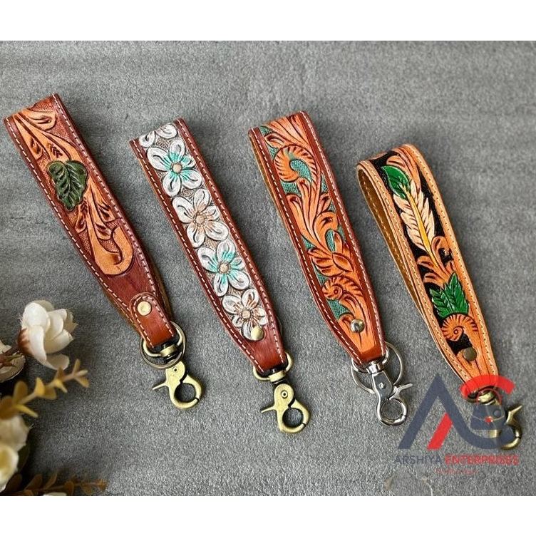 New Arrival Hand Tooled Leather Wristlet Key Fobs Embossed Floral Print Leather Key Rings Tooled Leather Accessories Key Straps