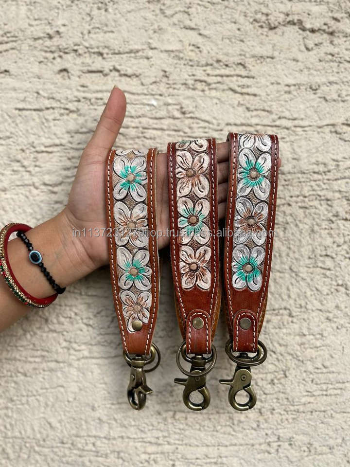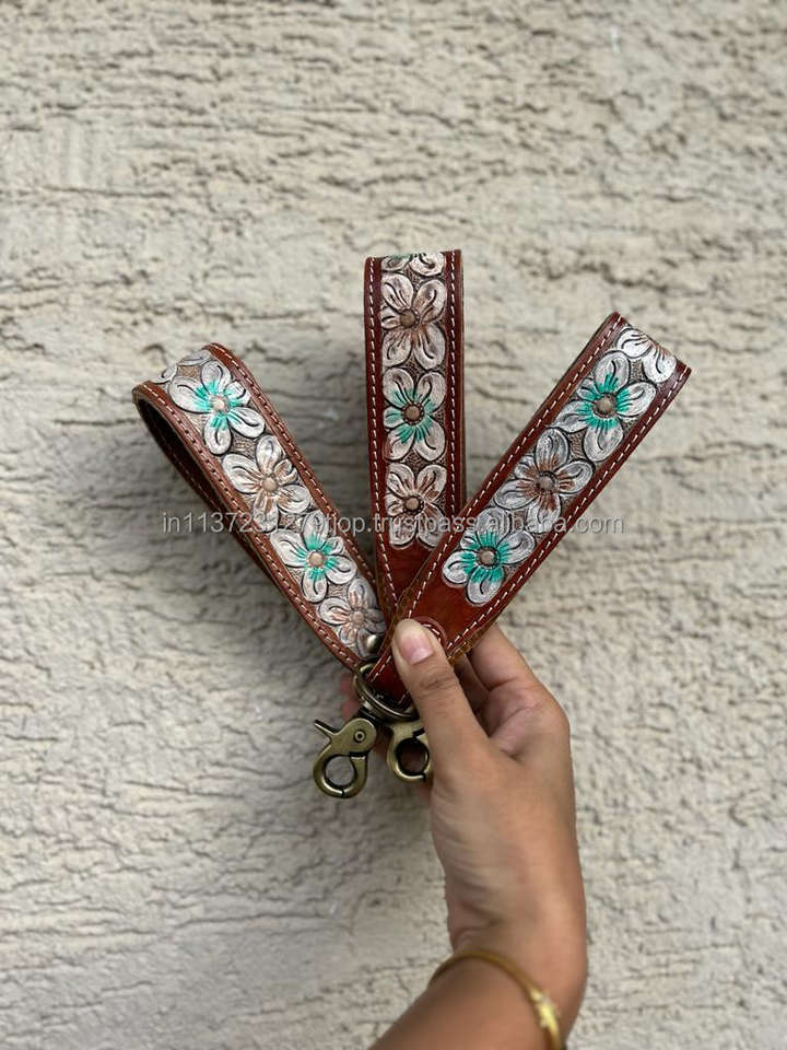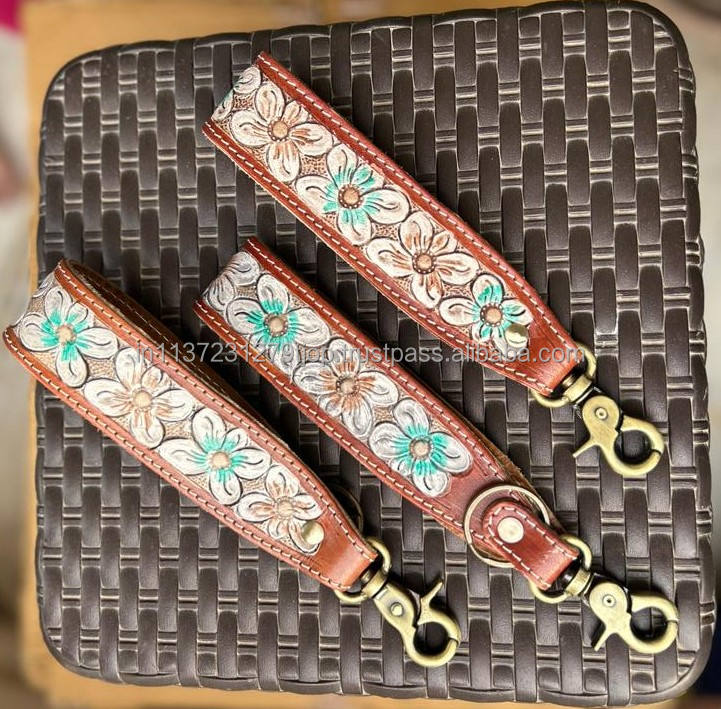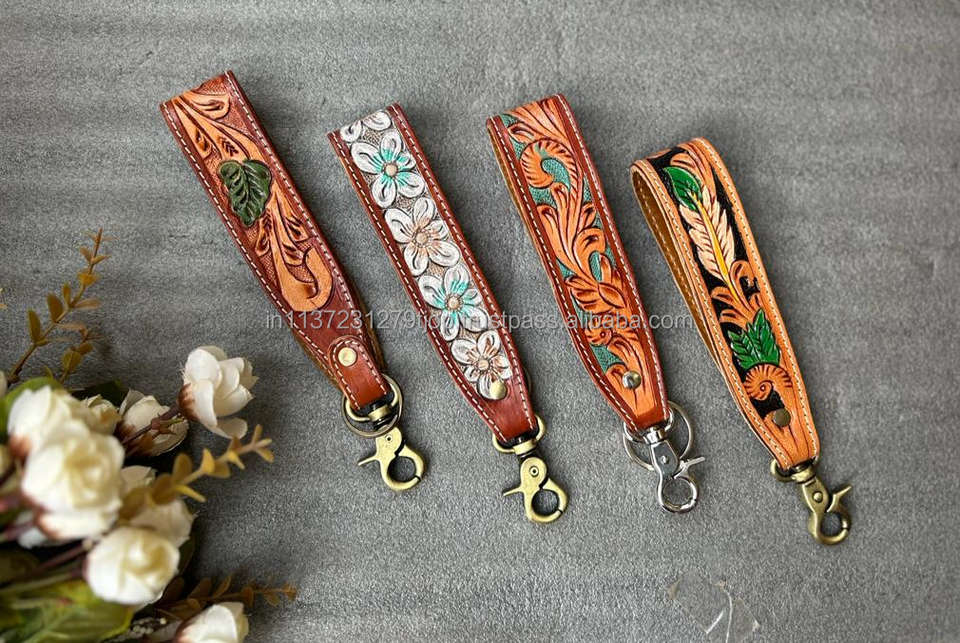 New Arrival Hand Tooled Leather Wristlet Key Fobs Embossed Floral Print Leather Key Rings Tooled Leather Accessories Key Straps