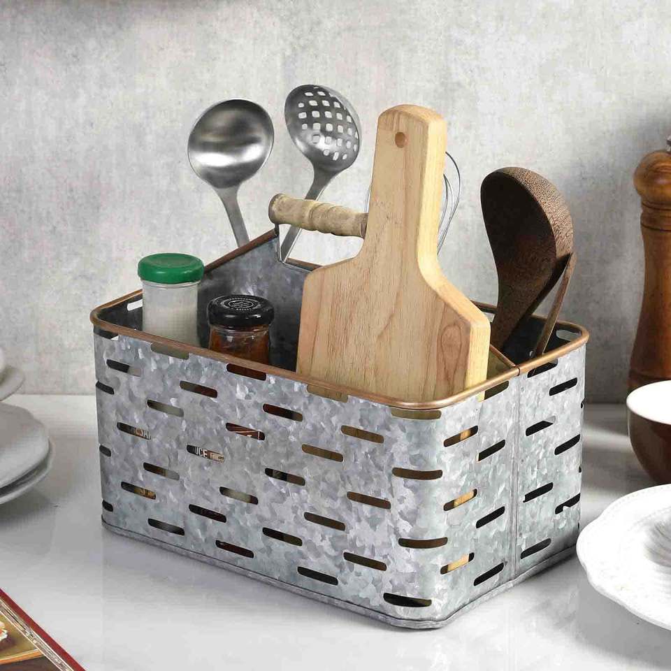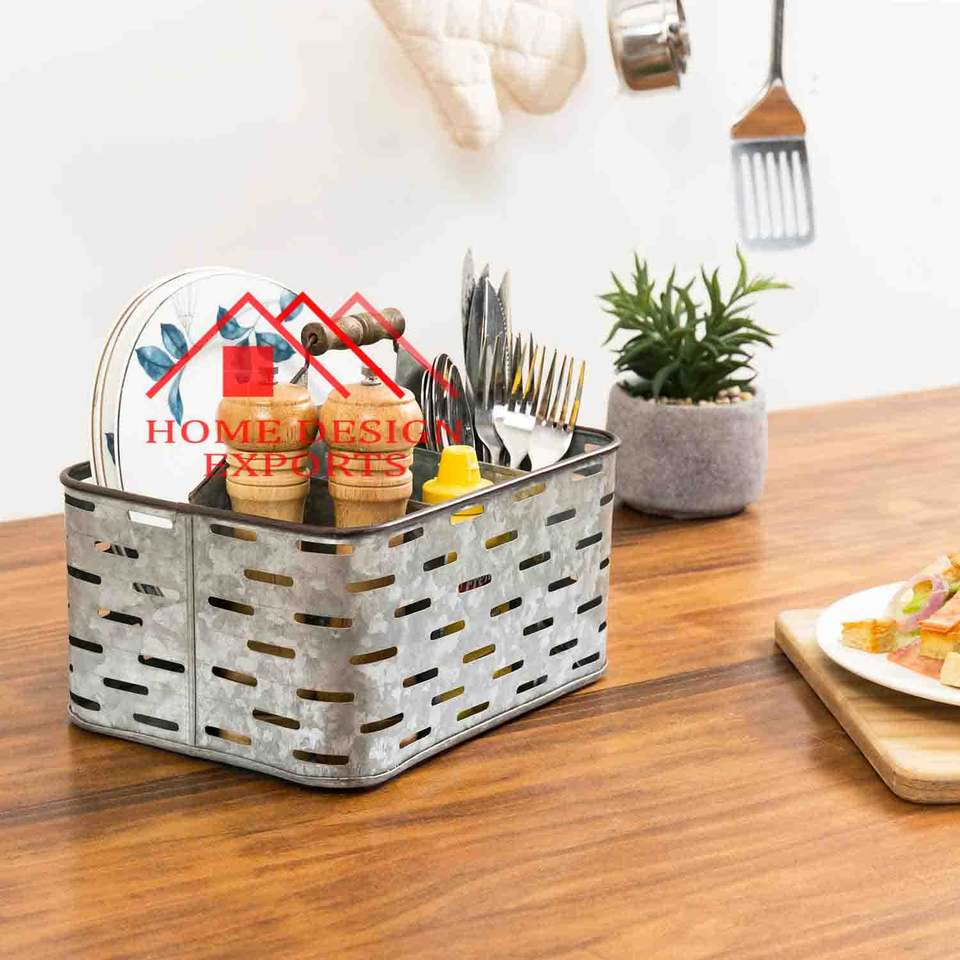 New Arrival Handmade Galvanized Metal Cutlery Utensil Caddy 4 Section Compartments Kitchen Storage Best Seller Flatware Caddy