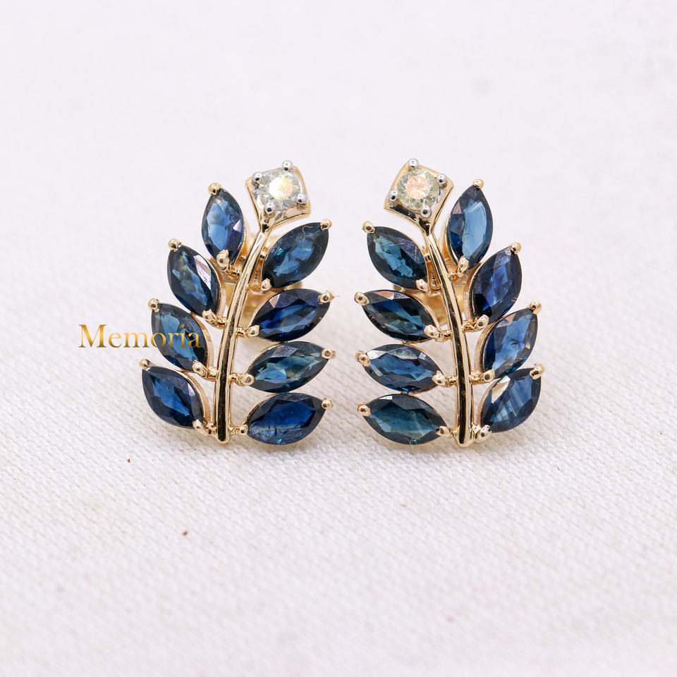 New Arrival Handmade Women's 14K Solid Yellow Gold Stud Earrings Precious Blue Sapphire Diamond Gemstone for Weddings Jewelry