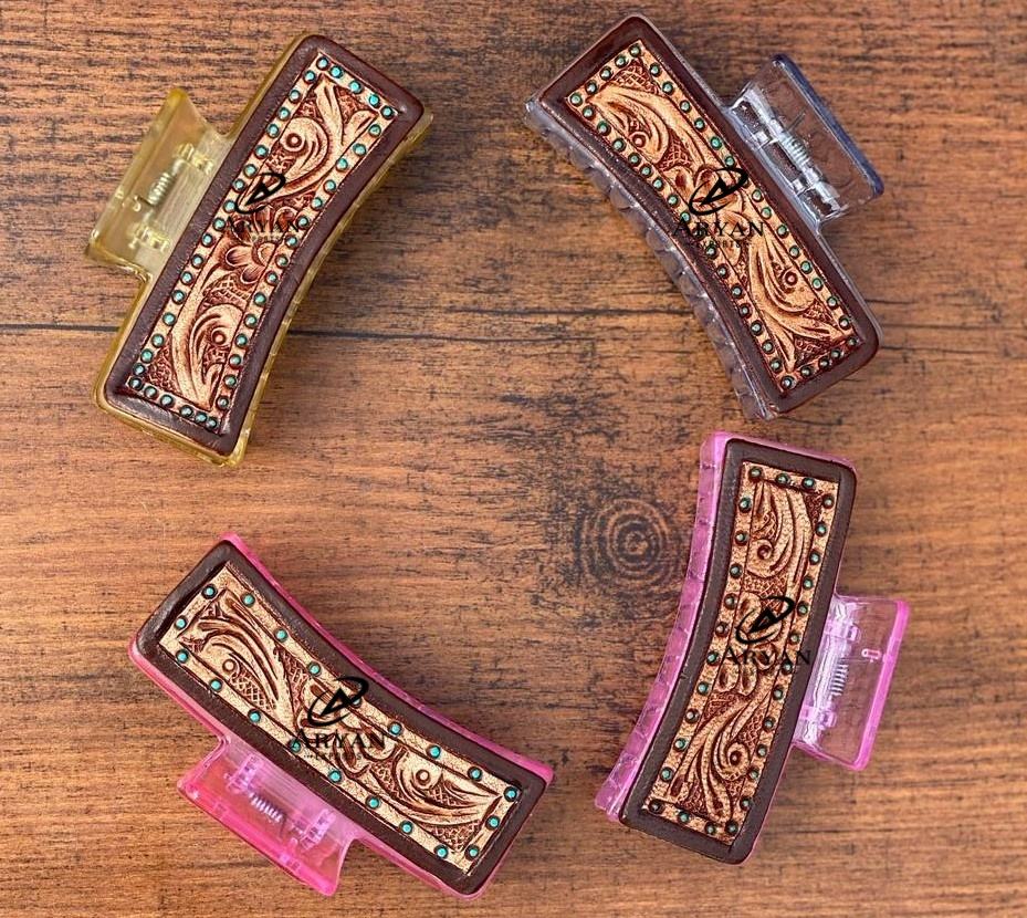 New Arrival Hot Selling Western Stylish Handmade Tooled Engraved Leather Hair Claw Clips Leather Claw Hair Accessories for Women