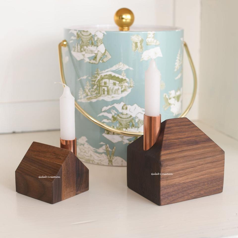 Rustic Hut Shape Wooden Candlestick Holder with Shiny Copper Topper Decorative Taper Candle Stand for Home, Event,Festive Decor
