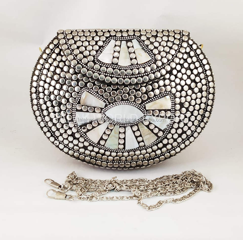 High Quality Ethnic Vintage Brass Metal Oxidized Silver Clutch Purse With Metallic Sling Antique Designer Purses for Wending Bag