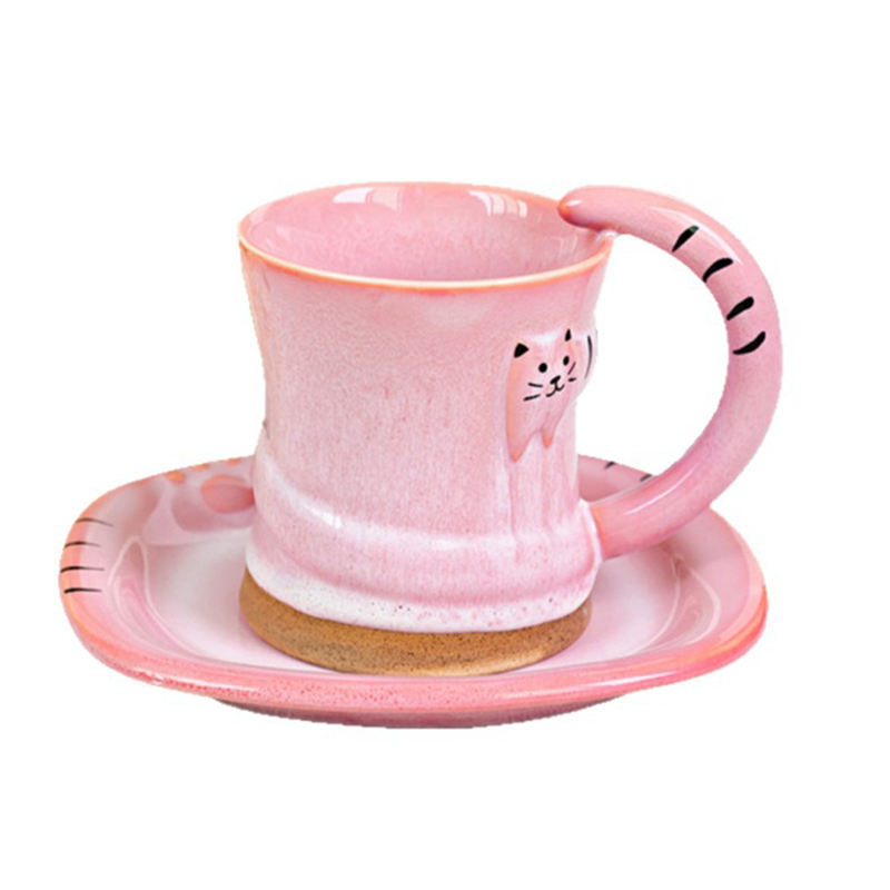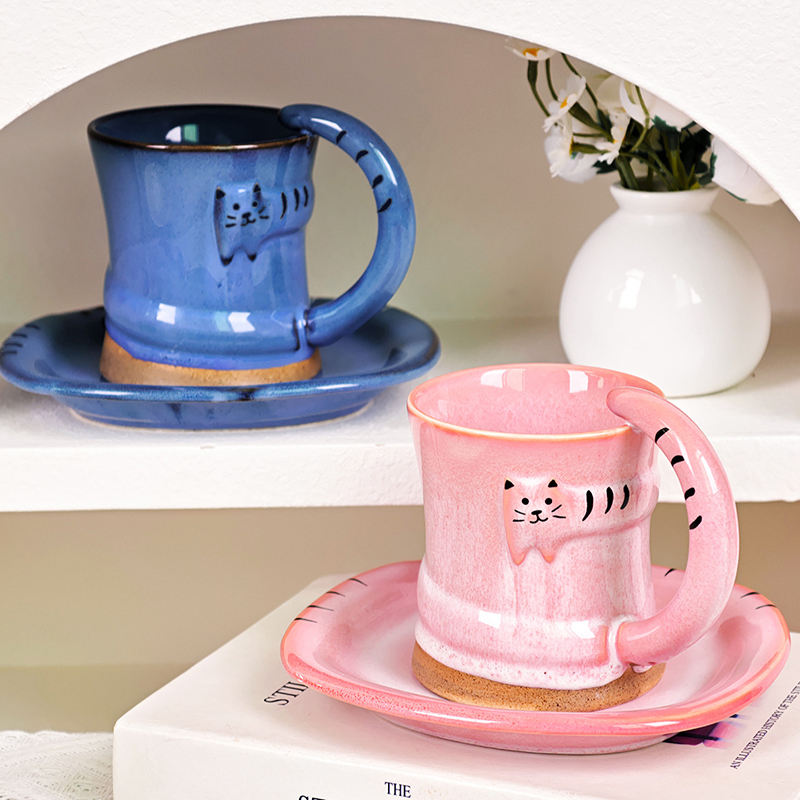 New Arrival Korean Hand Painted Embossed Cat Ceramic Coffee Mug and Saucer Set Creative Kiln Change Afternoon Tea Cup Set