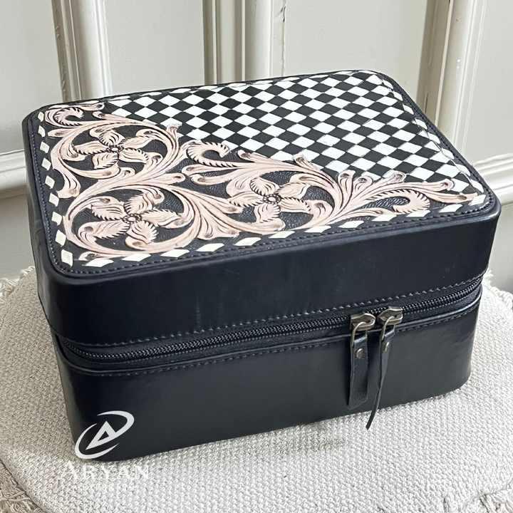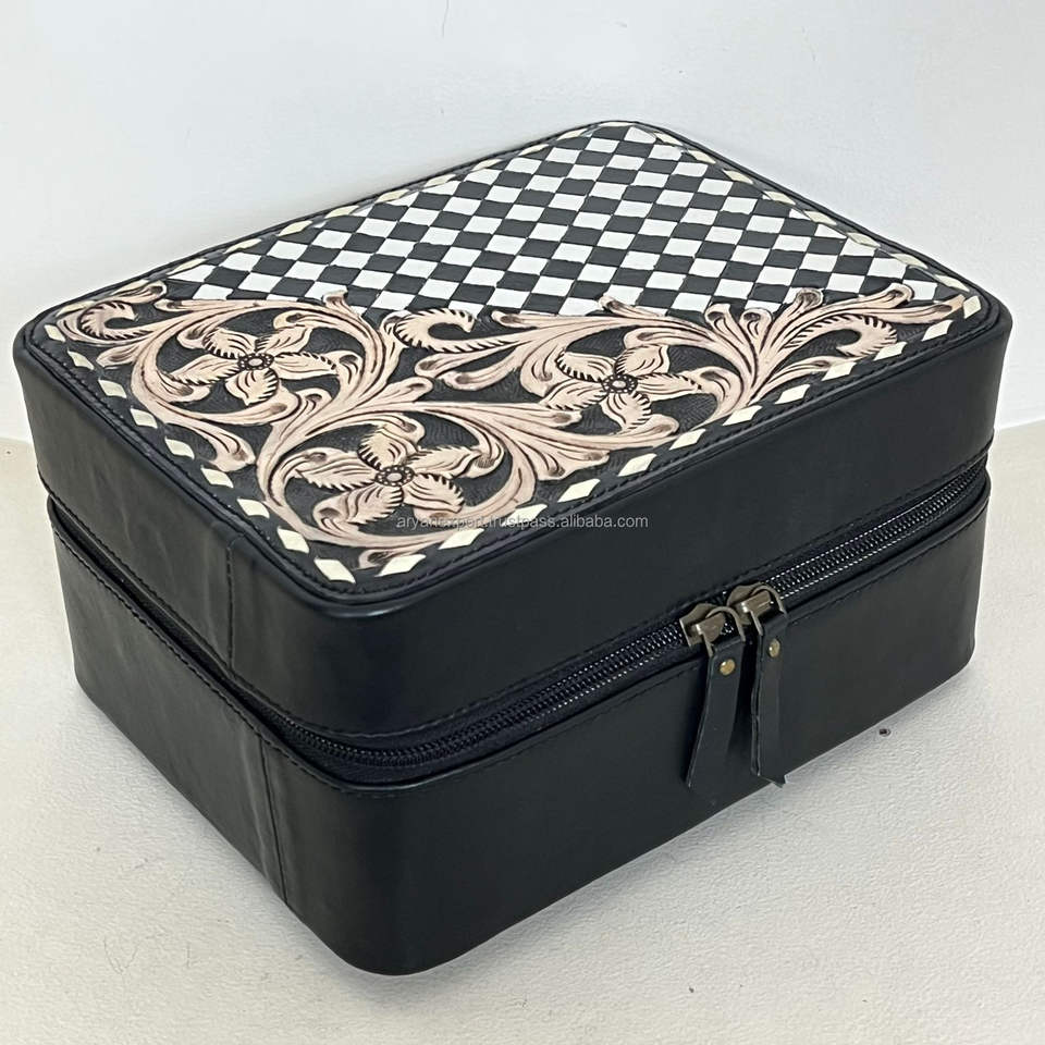 New Arrival Luxury Genuine Leather Jewelry Storage Cases Hand Tooled Floral Checkered Leather Velvet Interior Travel Organizer