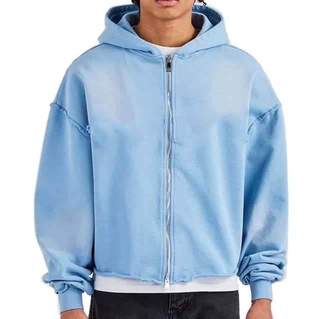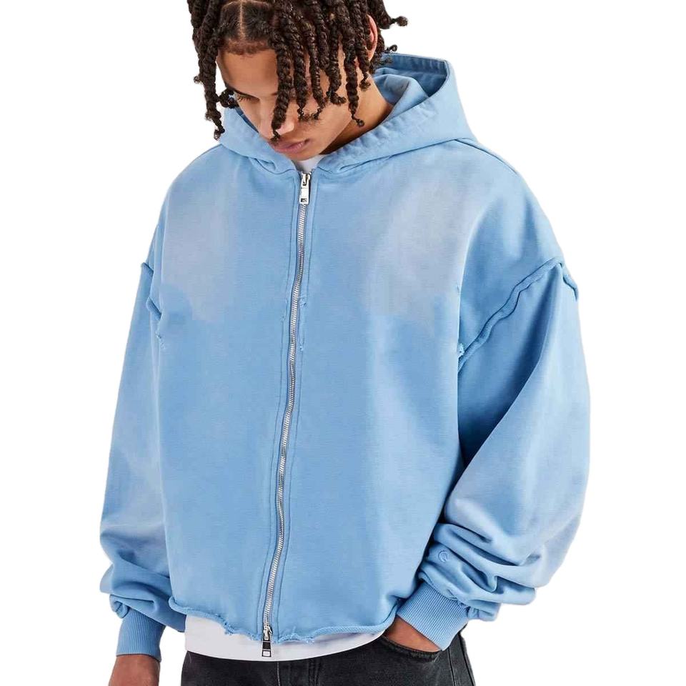 New Arrival Men's Casual Acid Washed Hoodie Blue Oversized Loose Zip-up with Front Logo Spring Autumn Regular Used Wholesale