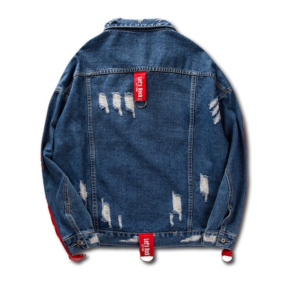 New Arrival Mens Hiphop Jeans Jacket Blue Black Jacket With Red Side Stripes Ripped Denim Coat Distressed Bomber Solid Jacket