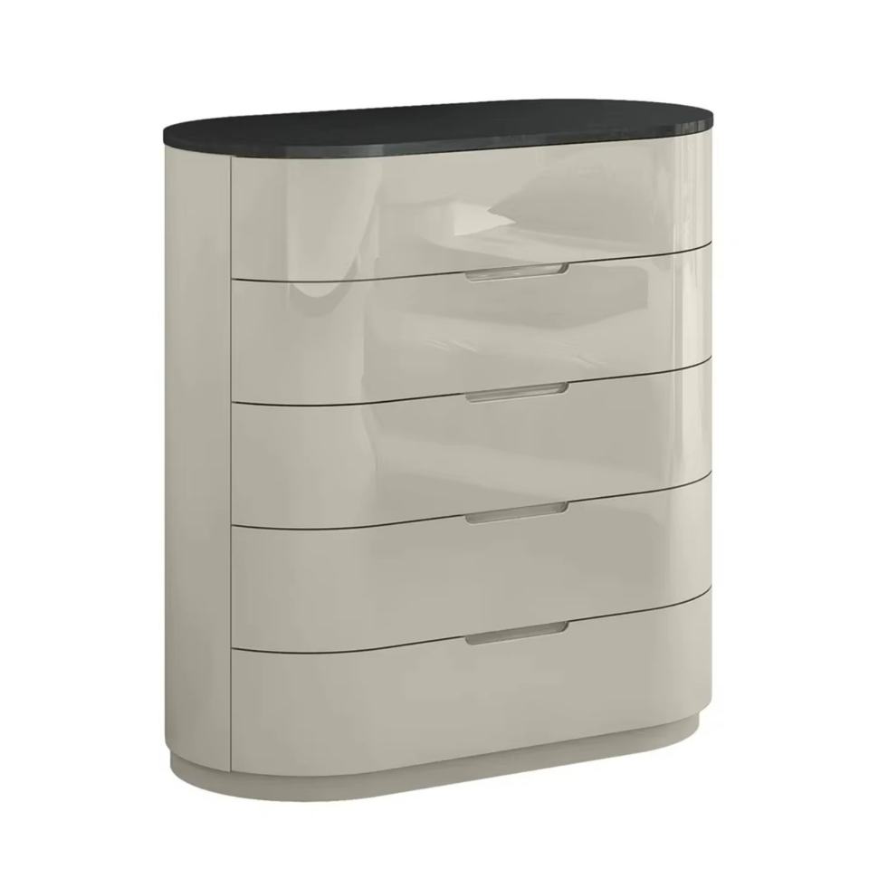 New Arrival Modern White Wooden Dresser with 5 Drawers High Gloss Oval Top Board for Bedroom Storage and Living Room Use