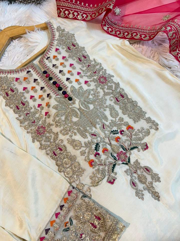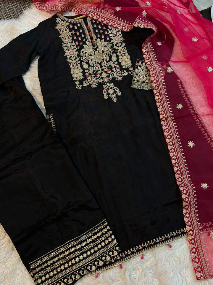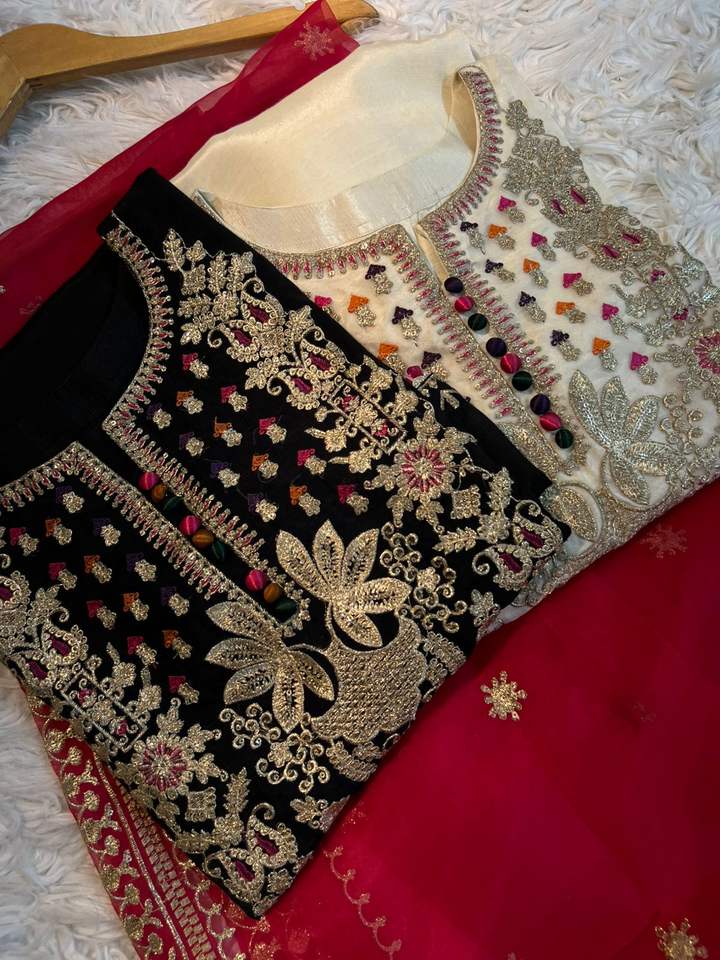 New Arrival Multi-Thread Embroidered Rawsilk Tilla Shirt Black White Fabric Korean Lace Tussles Contrast Organza Anarkali Desi