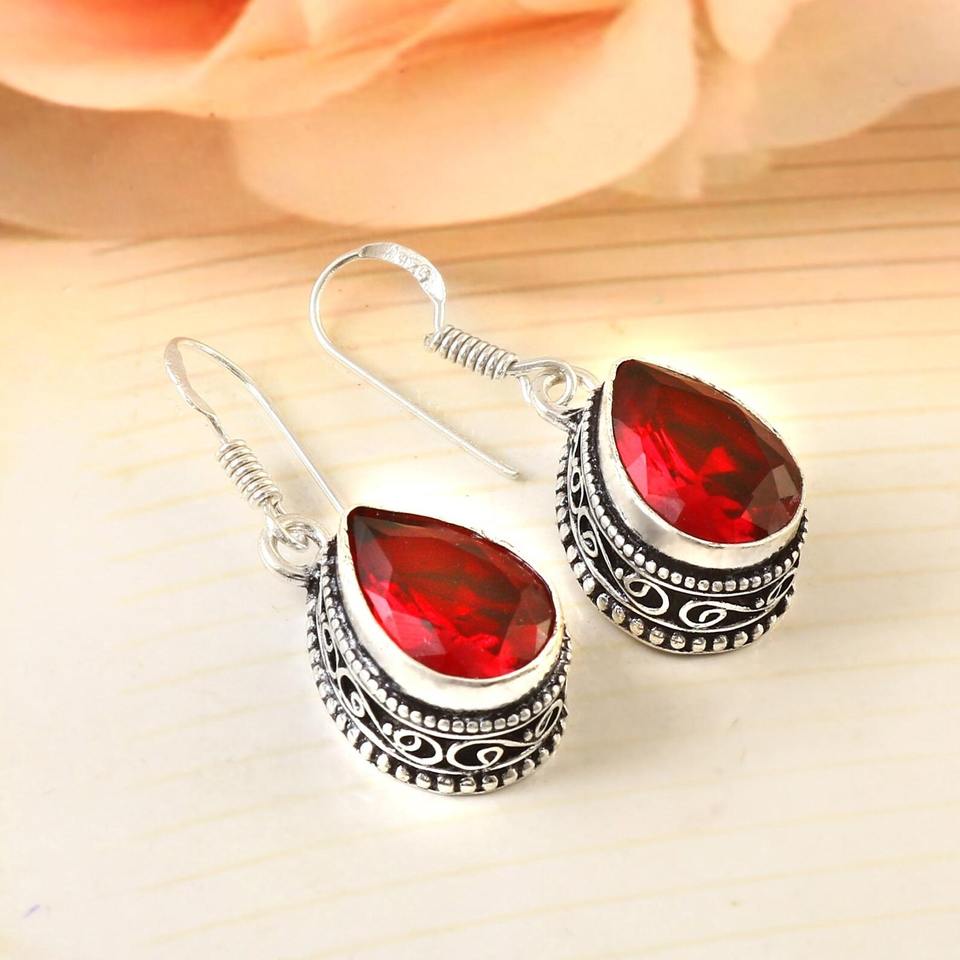 New Arrival Natural Garnet Quartz Gemstone Oval Faceted Vintage Bohemian Baho Sterling Silver-Plated Dangle Drop Earrings