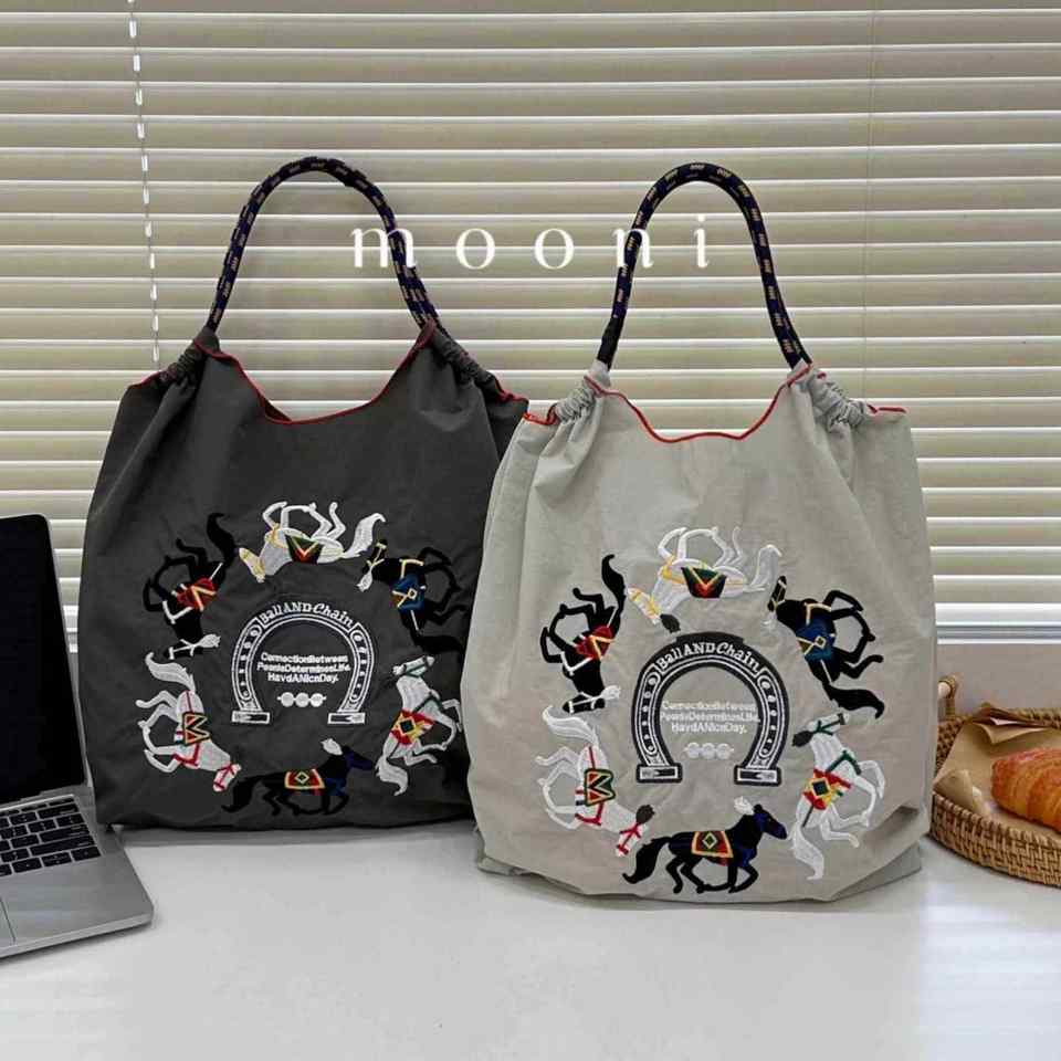 New Arrival Portable Nylon String Closure Embroidery Shopping Bag Girls Handbag Fashion Cute Cartoon Shoulder Bag