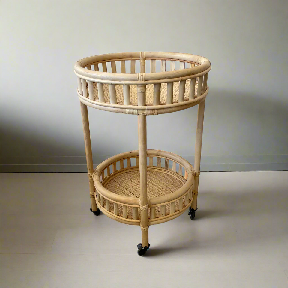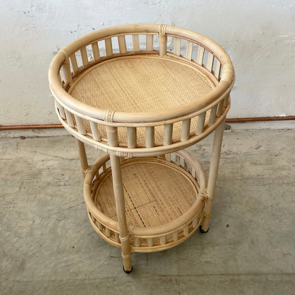 New Arrival Rattan Bar Cart Two Tier Natural Cane Serving Trolley Round Drink Storage Shelf for Living Room Home Decor