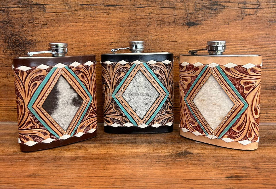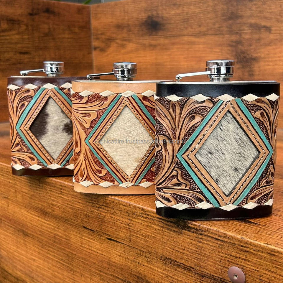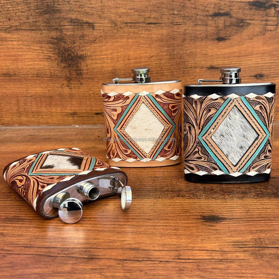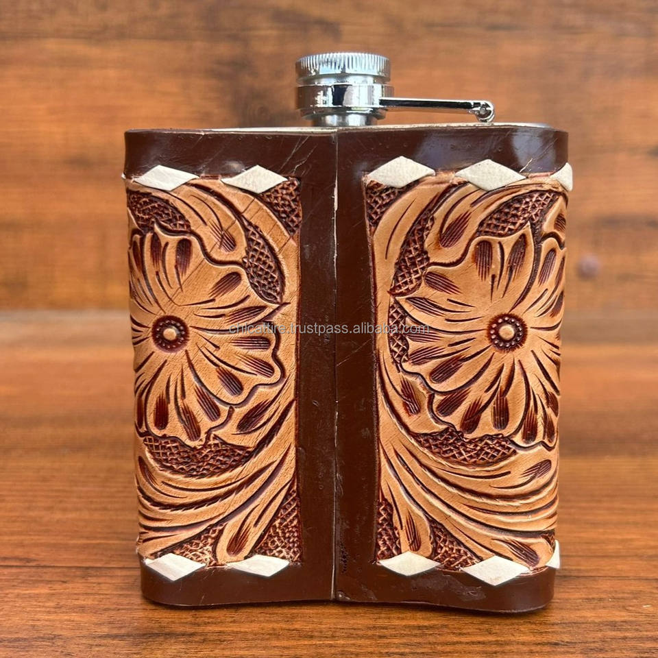 Hand Tooled Cowhide Leather Stainless Steel Hip Flask