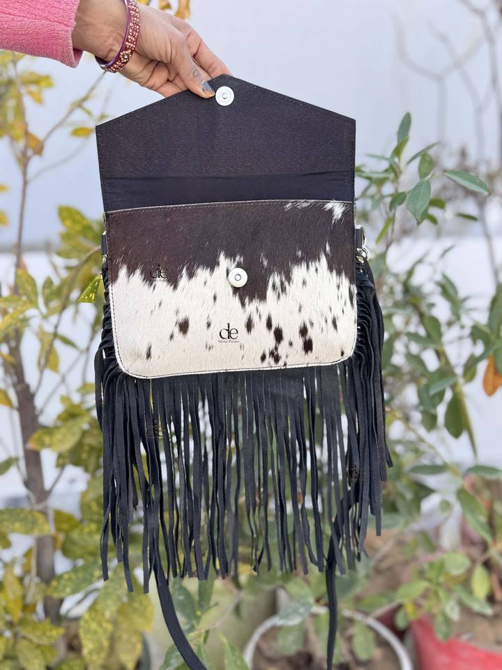 New Arrival Real Cowhide Fur Leather Fringe Bag Hand Tooled Leather Cross Body Sling Bag Gypsy Boho Handmade Multi Uses Bags