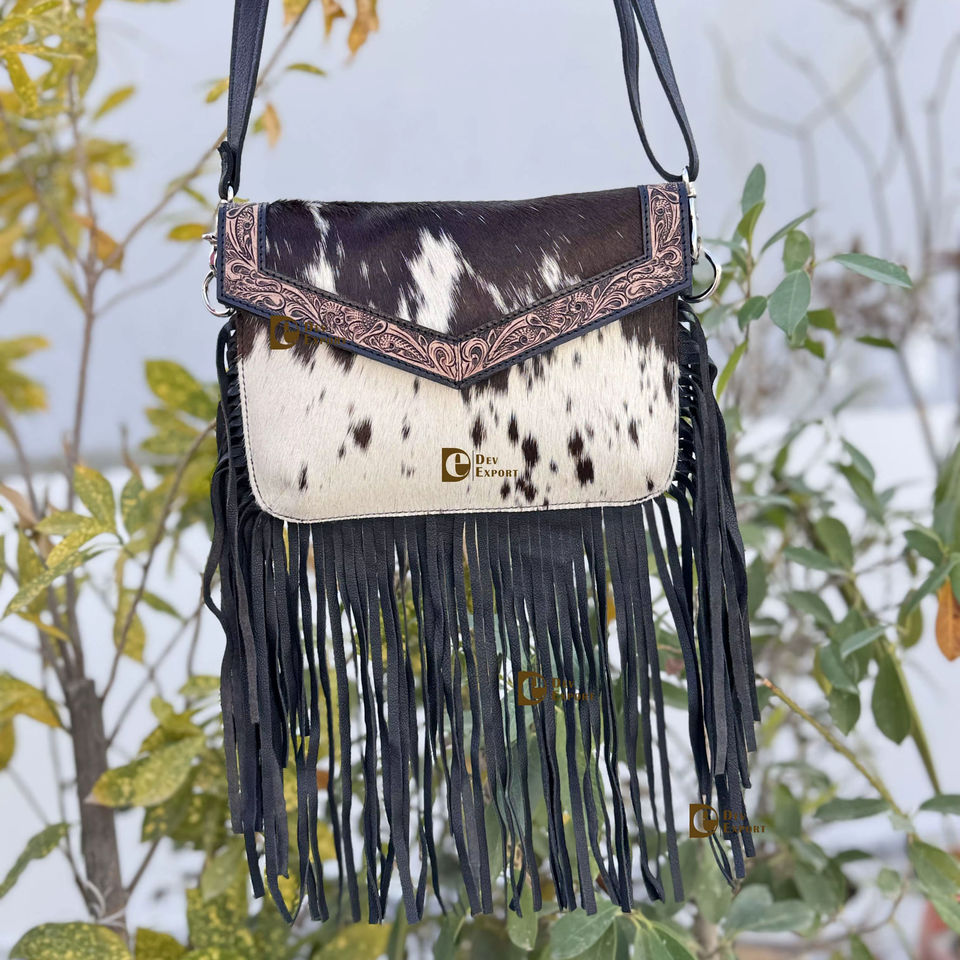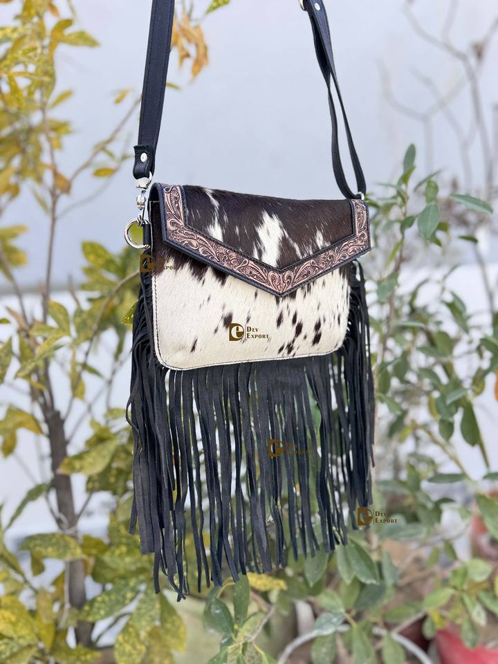 New Arrival Real Cowhide Fur Leather Fringe Bag Hand Tooled Leather Cross Body Sling Bag Gypsy Boho Handmade Multi Uses Bags
