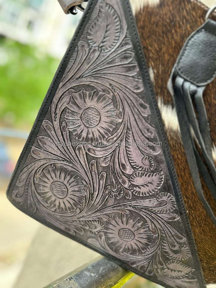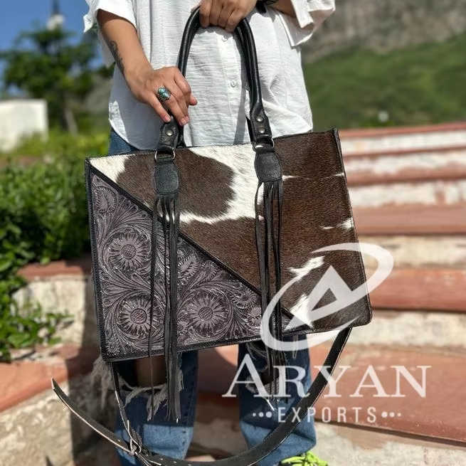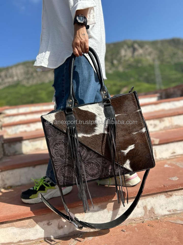 New Arrival Real Cowhide Fur Tote Bag Stylish Leather Purse Hair on Hide Carving Hand Tooled Bags for Women's Multi Use