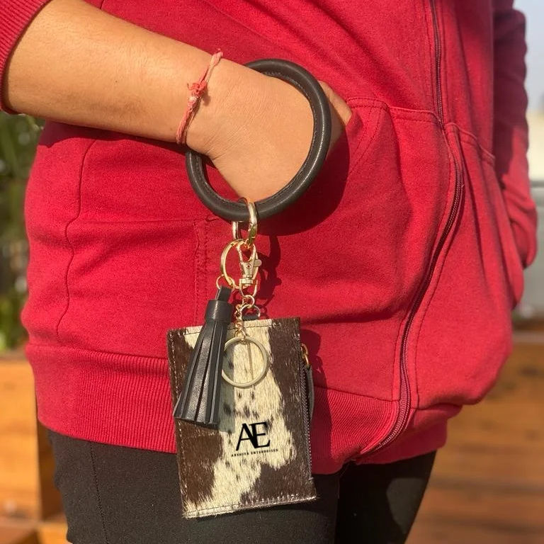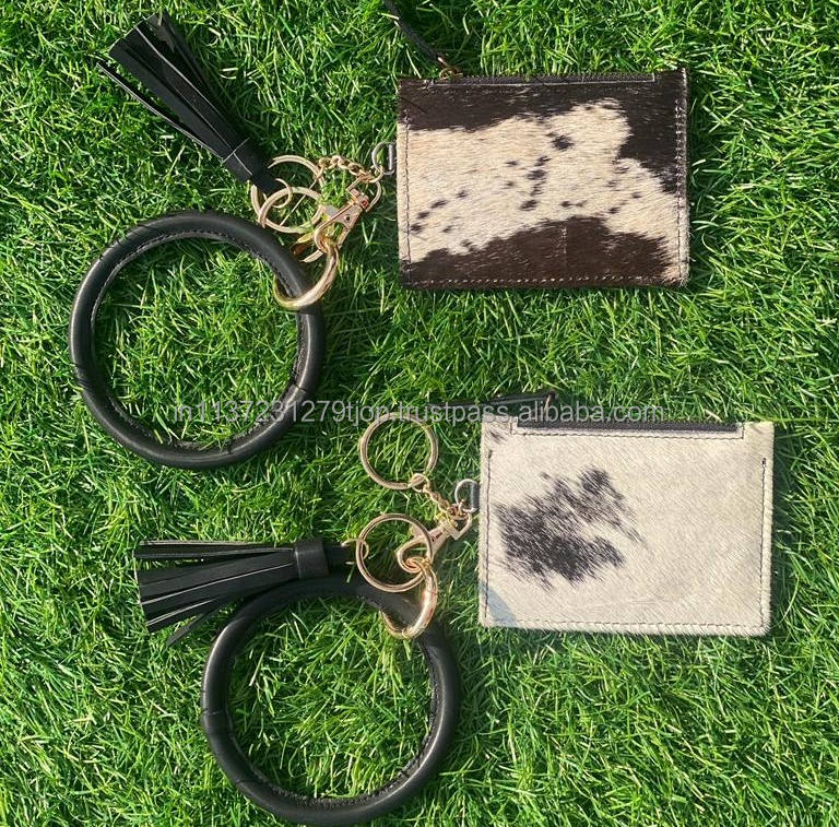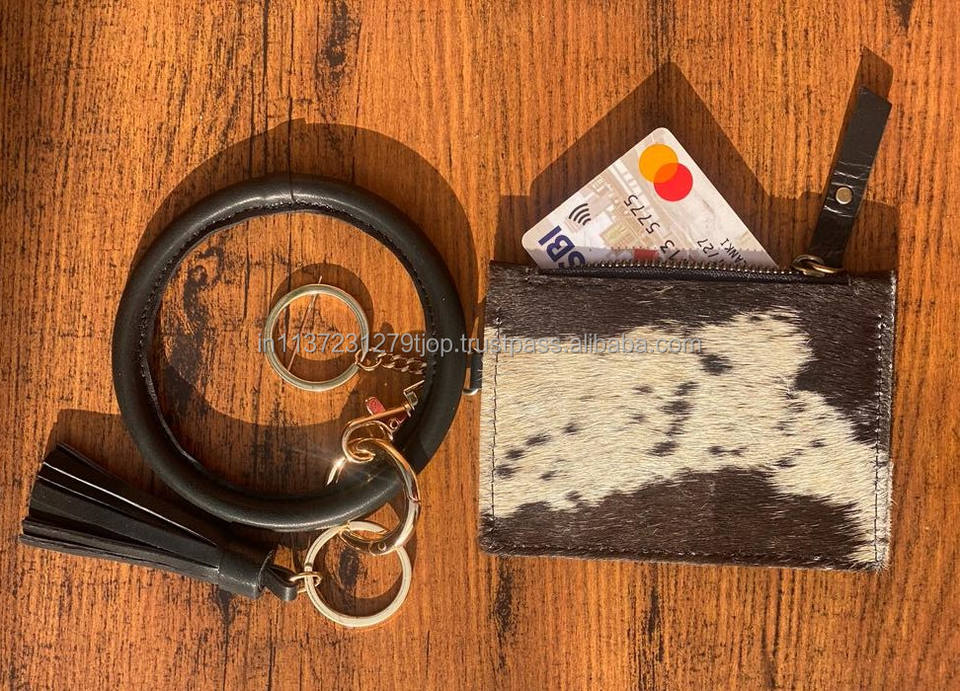 Cowhide Fur Leather Card Coin Case Wallets With Keyrings