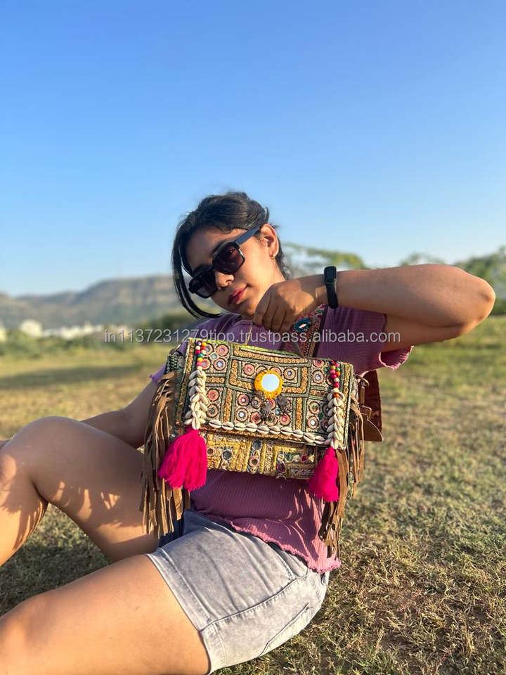 New Arrival Real Handmade Rajasthani Women Tribal Multi Color Cotton Fabric Boho Hippie Suede Leather Fringe Tassel Banjara Bags