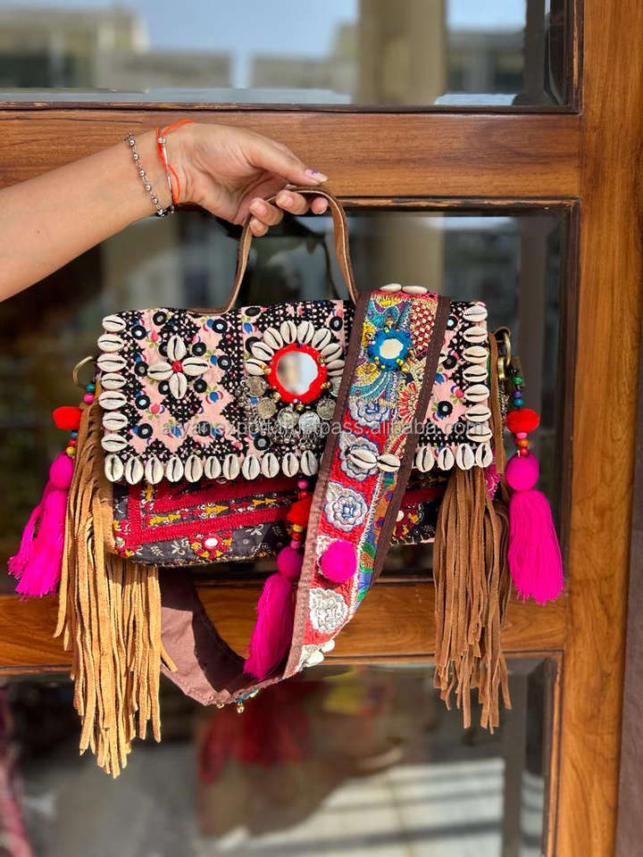 New Arrival Real Handmade Rajasthani Women Tribal Multi Color Cotton Fabric Boho Hippie Suede Leather Fringe Tassel Banjara Bag