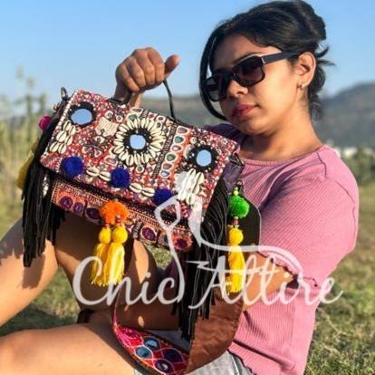 New Arrival Real Handmade Rajasthani Women Tribal Multi Color Cotton Fabric Boho Hippie Suede Leather Fringe Tassel Banjara Bag