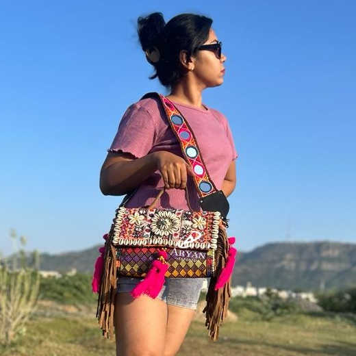 New Arrival Real Handmade Rajasthani Women Tribal Multi Color Cotton Fabric Boho Hippie Suede Leather Fringe Tassel Banjara Bag