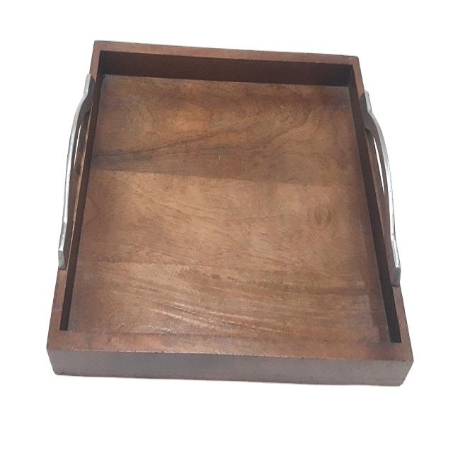 New Arrival Rustic Brown Rectangle Wood Handmade Multi-Functional Tray Shiny Metal Handle Fruit/Geometric Design Easter Decor
