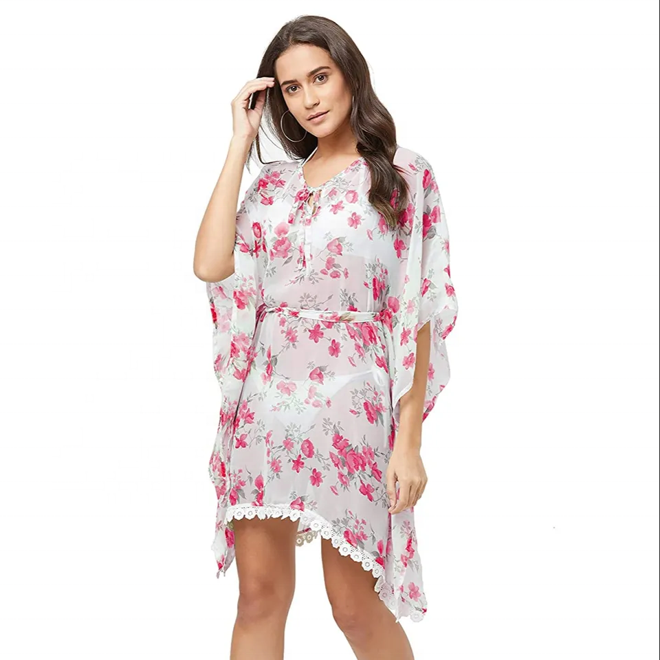 New Arrival Short Women Faux Georgette Floral Beach Wear Cover Ups Embroidered Kaftan Available in Bulk