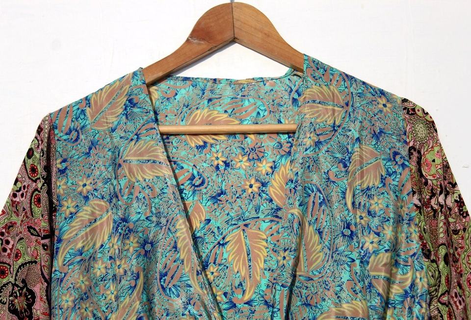 New Arrival Vintage Silk Handmade Printed Wrap Top Bell Sleeve Top Bell Sleeves Crop Top Tunic Dress for Women