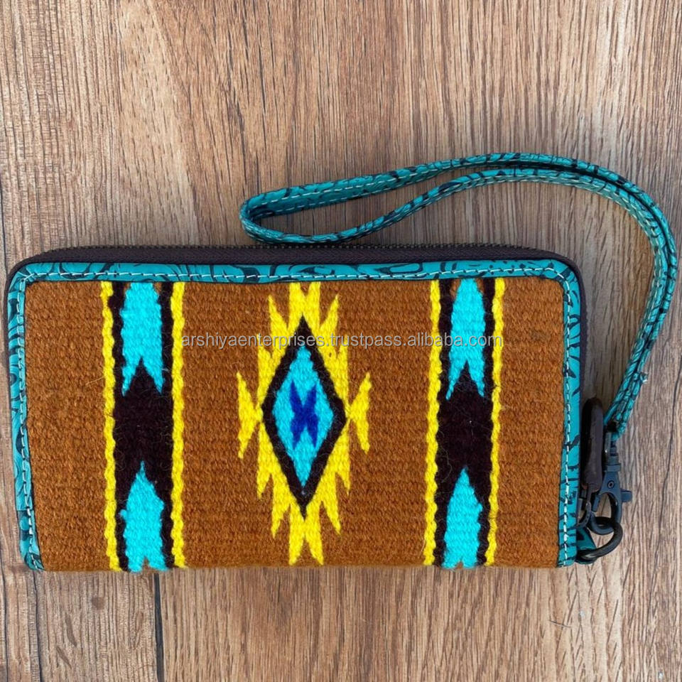 New Arrival Western Aztec Fabric Leather Hand Clutch Women Multi Color Purses Unique Aztec Quilted Leather Wristlet Wallets