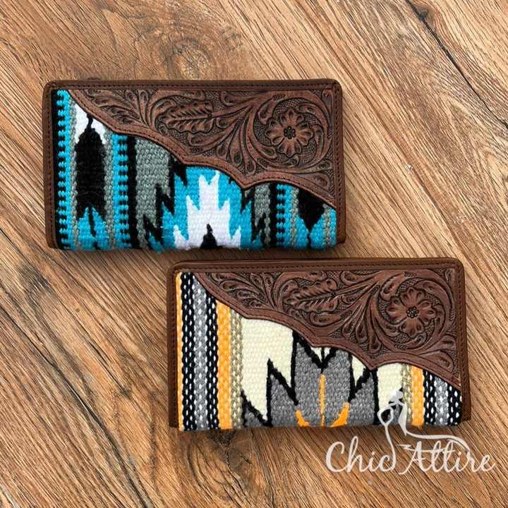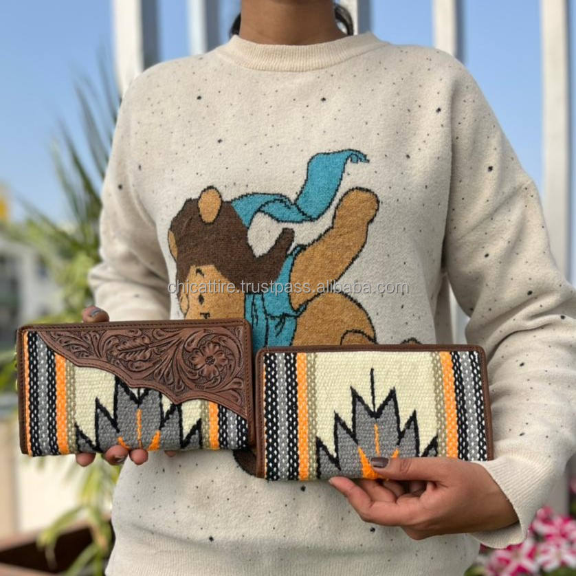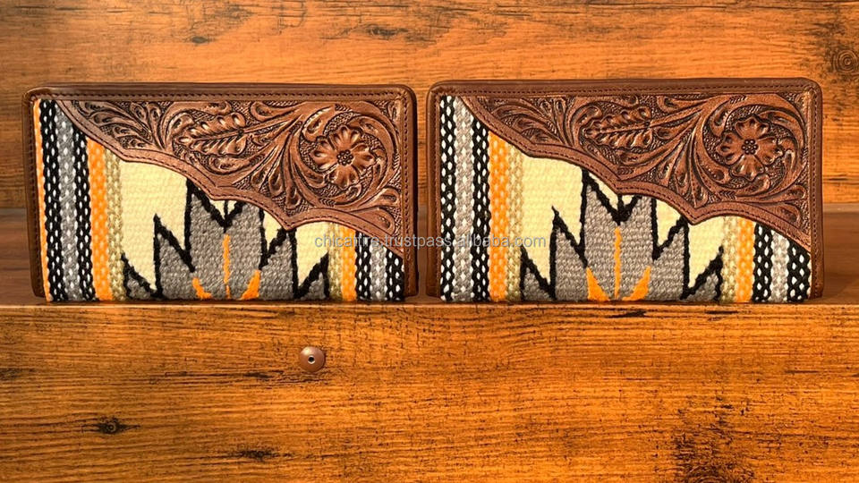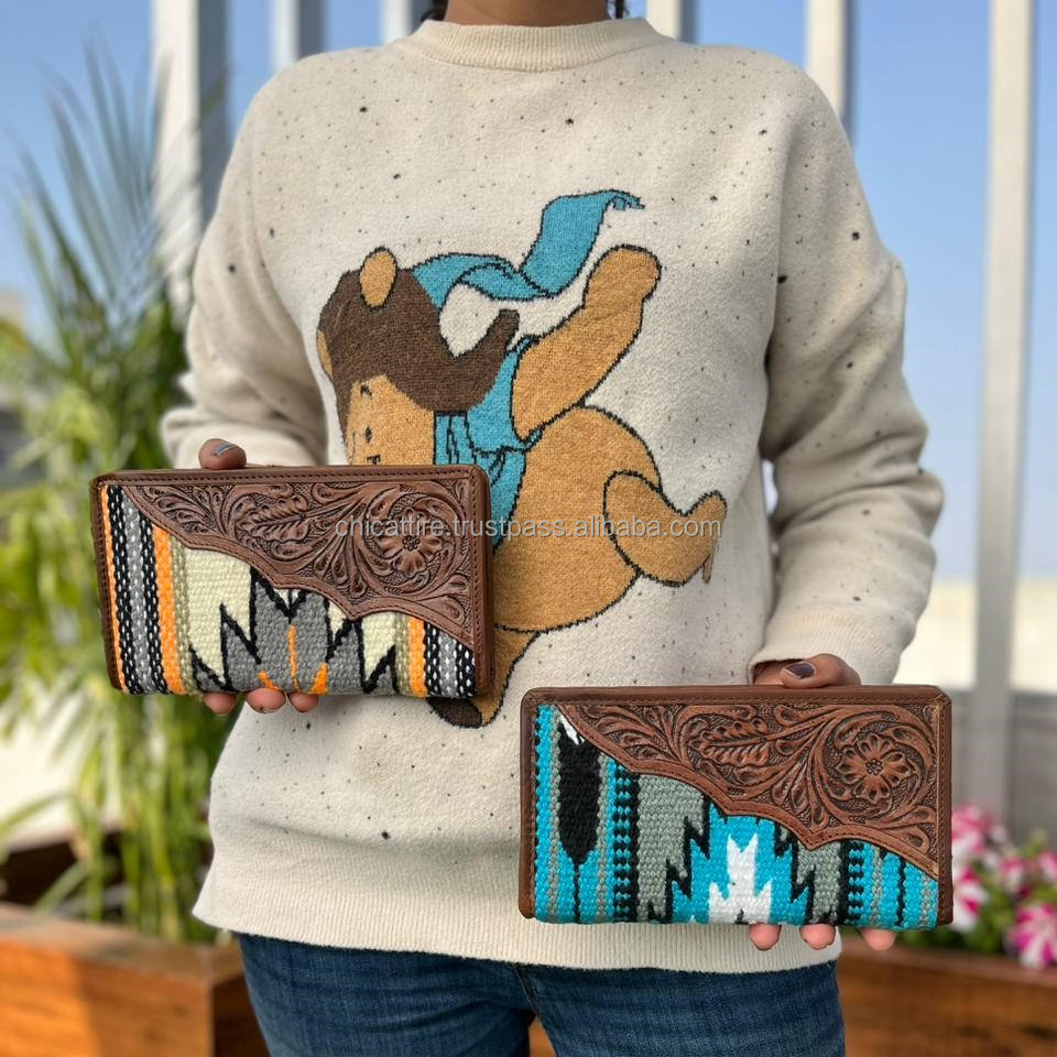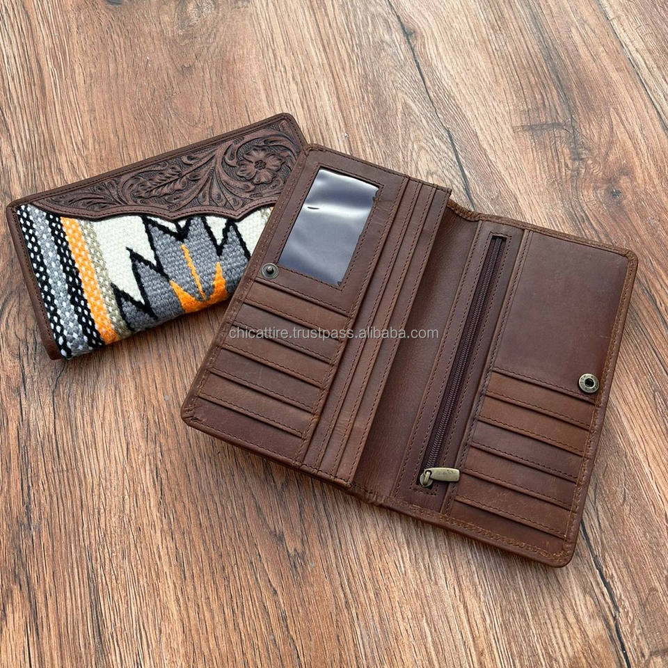 New Arrival Western Aztec Tooled Leather Hand Clutch Women Multi Bi-Fold Wallet Unique Aztec Quilted Leather Multiuse Wallets