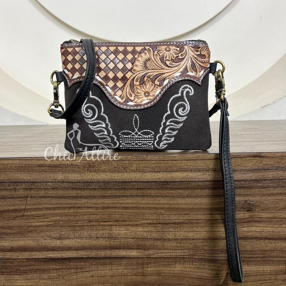 Product name:Hand Tooled Suede Leather Crossbody Bag With Wristlet