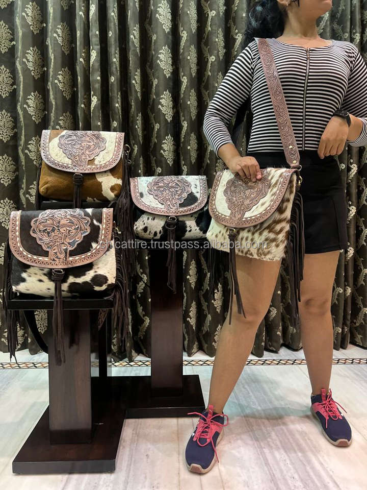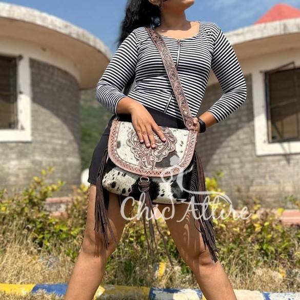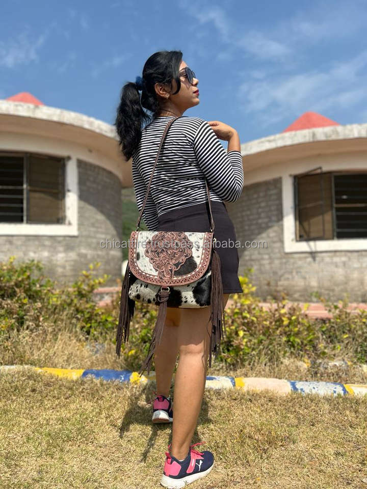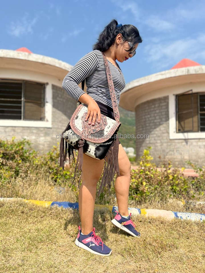 New Arrival Western Real Handmade Cowhide Fur Tooled Leather Fringe Sling Bag Stylish Women Concealed Carry Casual Crossbody Bag