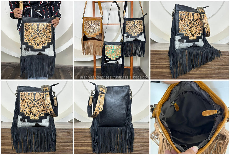 Product name:Hand Tooled Cowhide Fringe Crossbody Bag