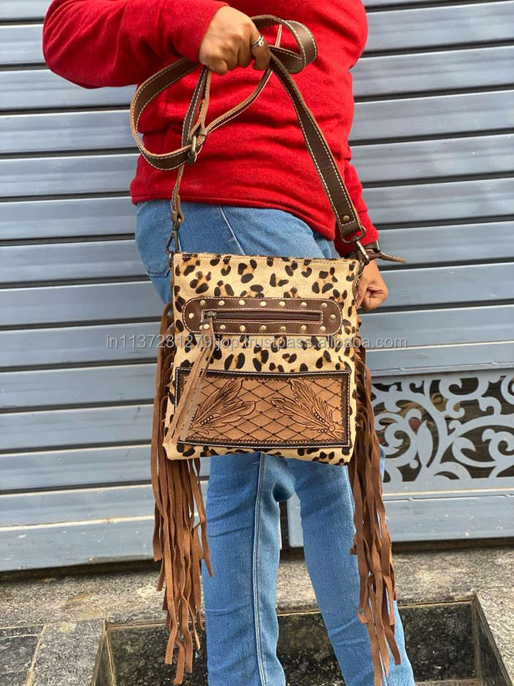 New Arrival Western Style Animal Fur Leather Fringe Handbag Leopard Print Sling Bag Hand Tooled Carving Bags Party Wear Women's