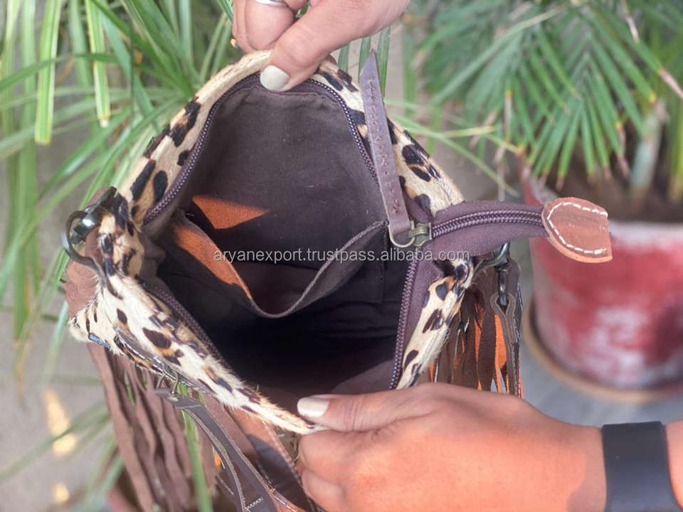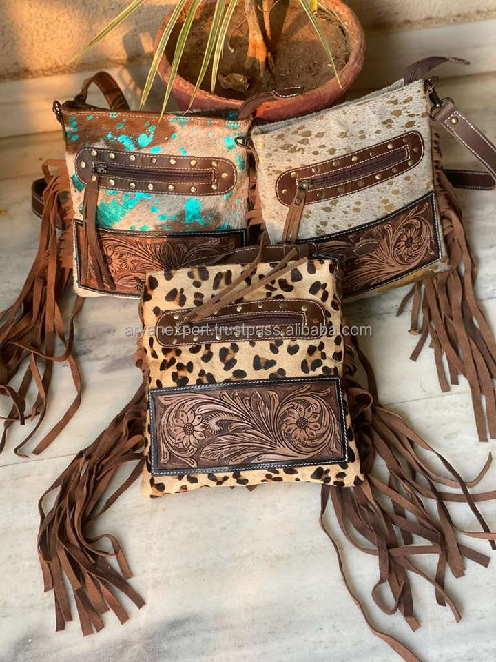 New Arrival Western Style Animal Fur Leather Fringe Handbag Leopard Print Sling Bag Hand Tooled Carving Bags Party Wear Women's
