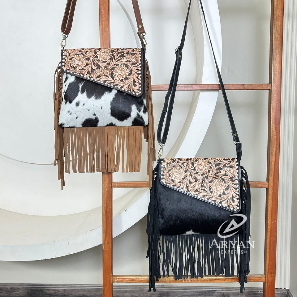 Hand Tooled Cowhide Leather Fringe Crossbody Bag