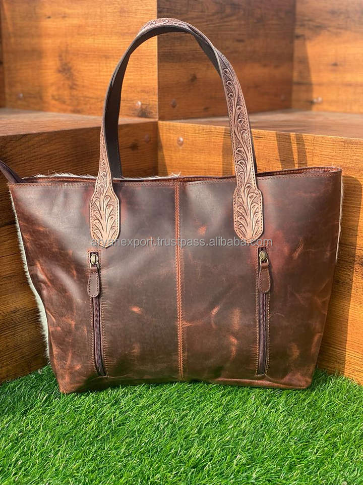 New Arrival Western Stylish Tooled Cowhide Leather Tote Bags Fashionable High Quality Tooled Women Concealed Carry Shopping Bags