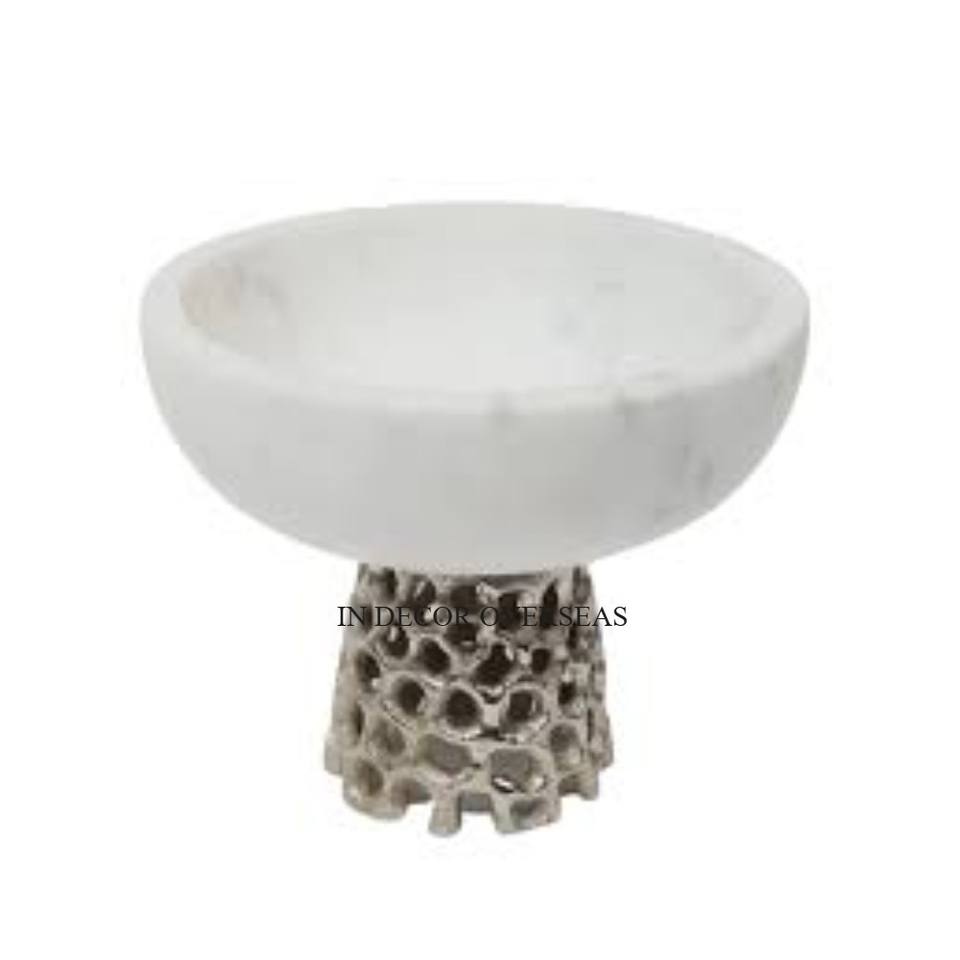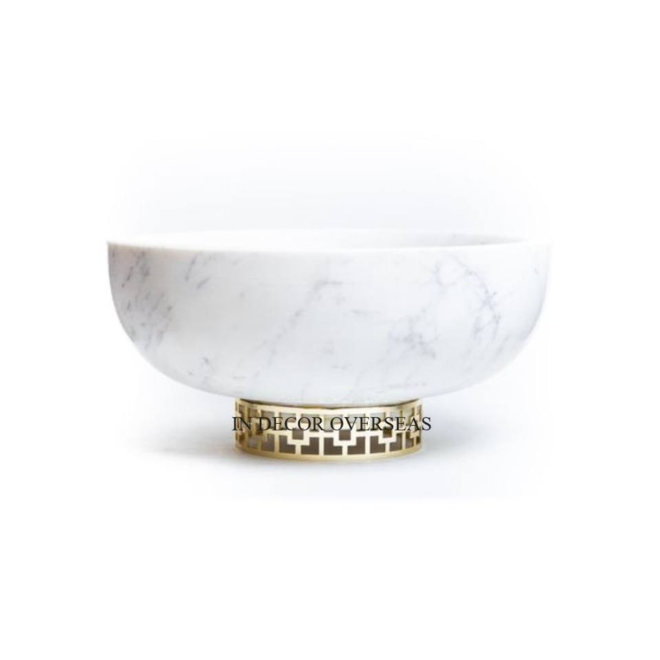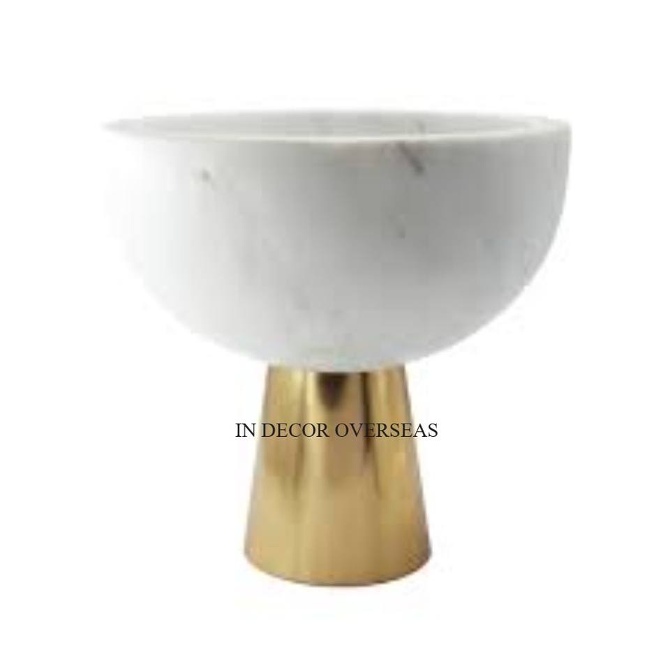New Arrival White Color Top Quality Marble Round Shape Fruits & Other Items Serving Bowl With Gold Plated Unique Metal Base