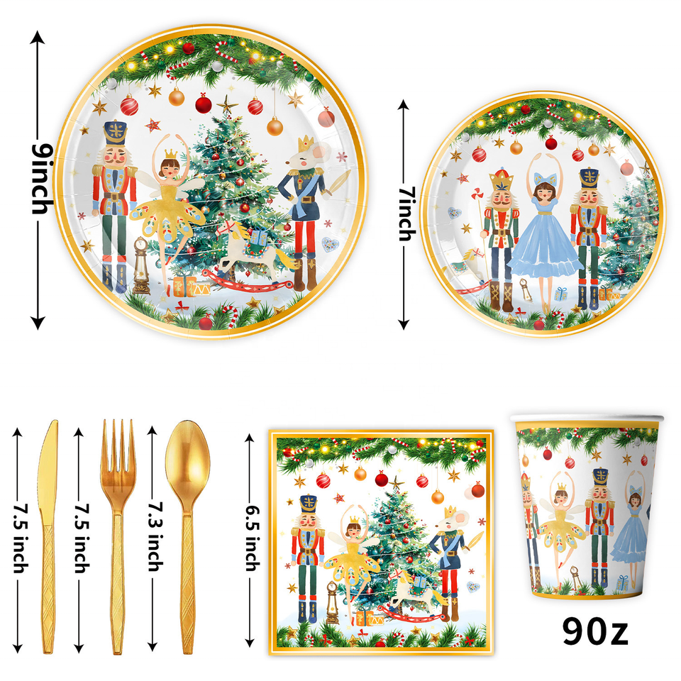 New Arrival White Nutcracker Theme Party Disposable Tableware Set Modern Paper Plate Cup Napkin Tablecloth for Christmas Parties