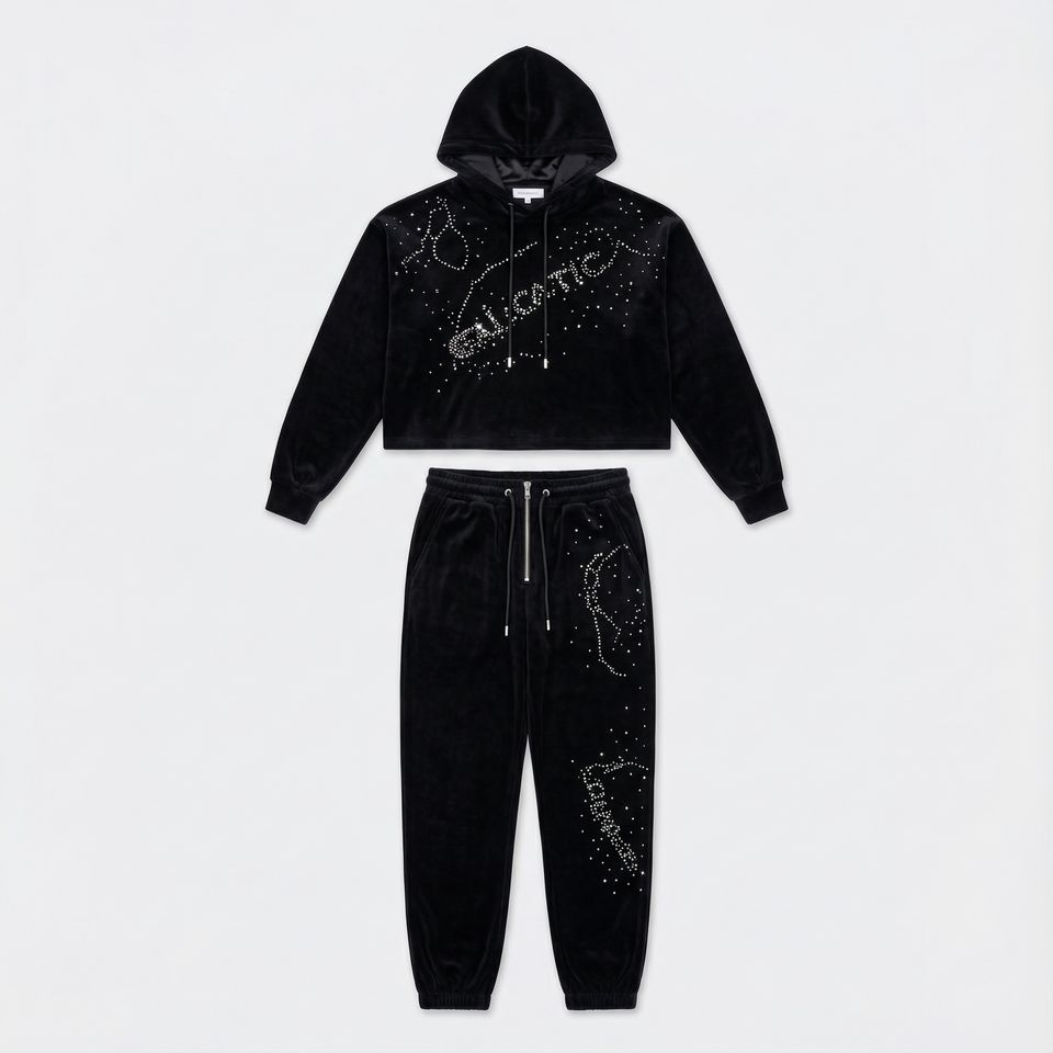 New Arrivals Luxury Velvet Tracksuit Set for Women Zip Jacket & Jogger Pants Rhinestone Galaxy Design Winter Wear