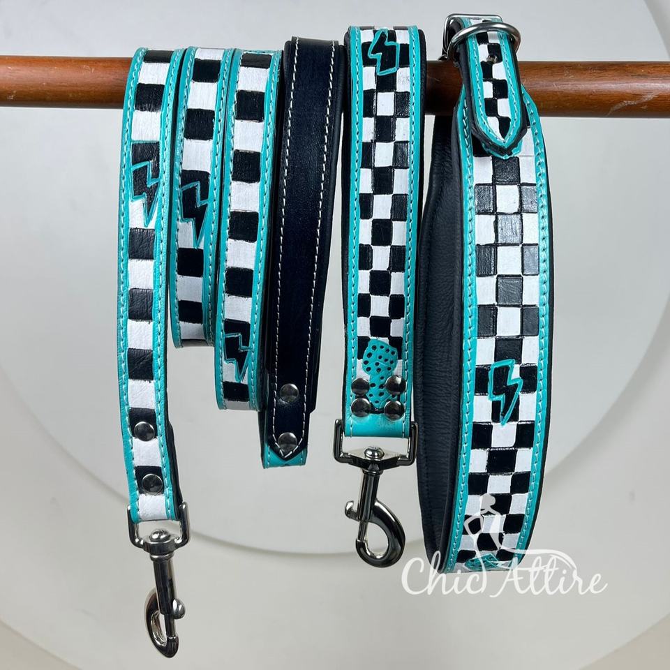 Hand Tooled Checkered Leather Dog Leash Set
