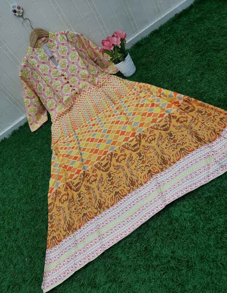 New Attractive Look Daily Wear Digital Printed Jarmon Slub Cotton Long Gown Indian Girls Wear Readymade Low Price Wholesale ApparelGarment