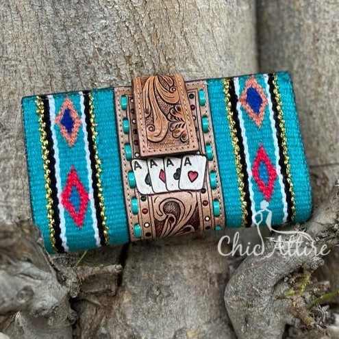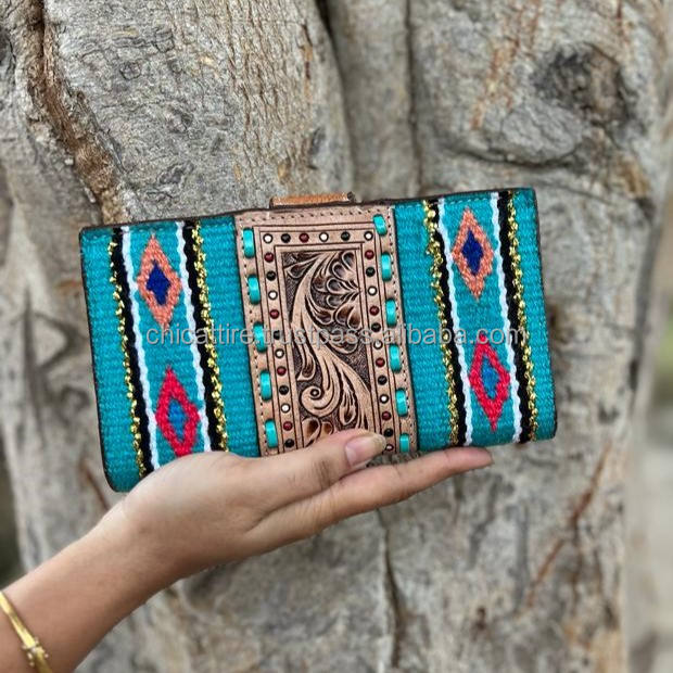 New Aztec Saddle Blanket Leather Clutch Western Stylish Bifold Women Wallets Hand Tooled Gamble Hot Selling Carving Clutches