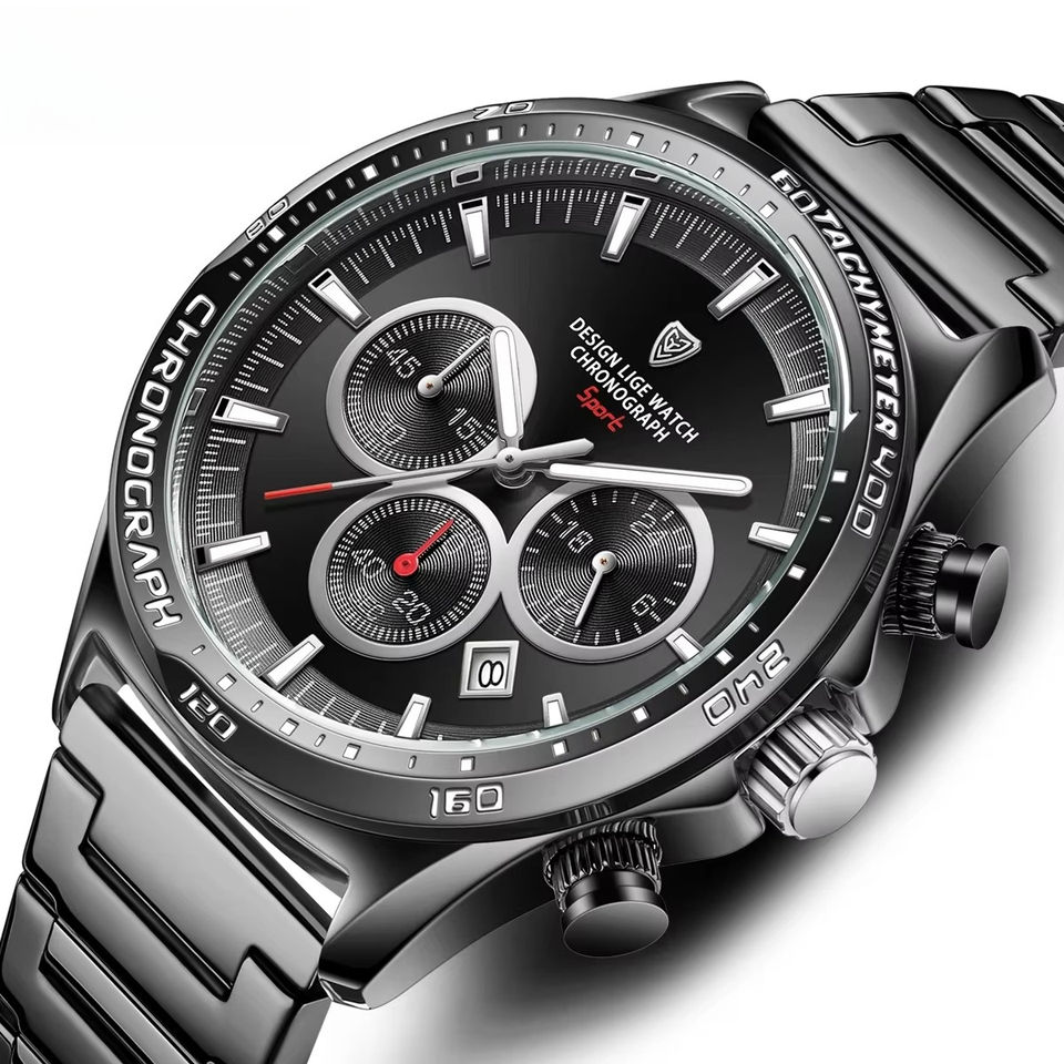 New Black Stainless Steel Band Business Fashion Sport Casual Quartz Men's Watch Waterproof Luminous Calendar Chronograph Pointer