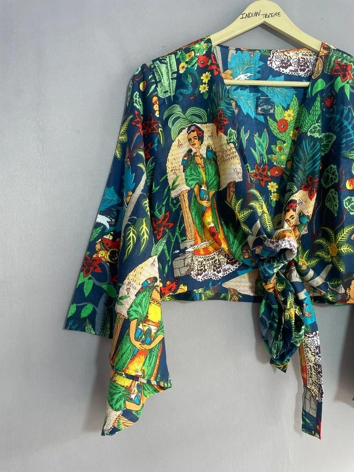 New Block Print Cotton Summer Long Sleeve Crop Top with Tie Front , Customizable Womens Garment , Handmade Bohemian Style Outfit