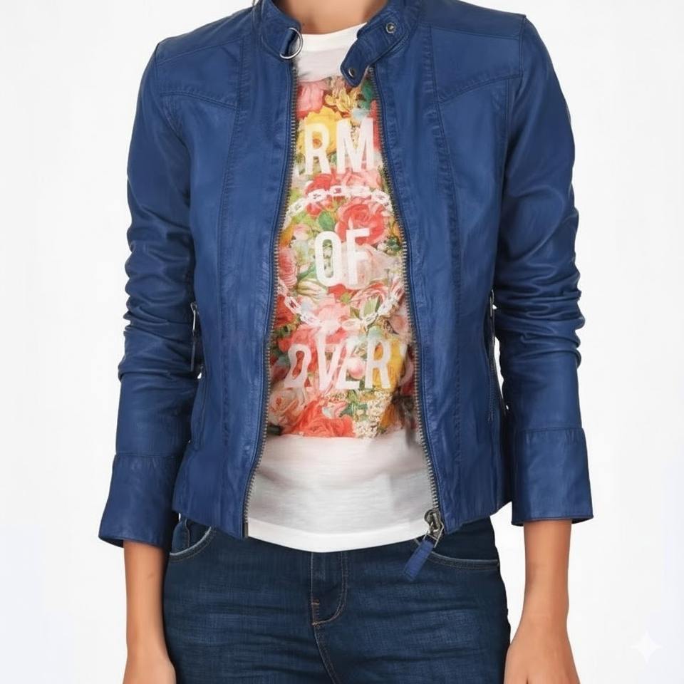 Premium Womens Blue Sheepskin Leather Motorcycle Jacket Slim Fit Soft Texture Breathable Waterproof Eco-Friendly Stylish Casual